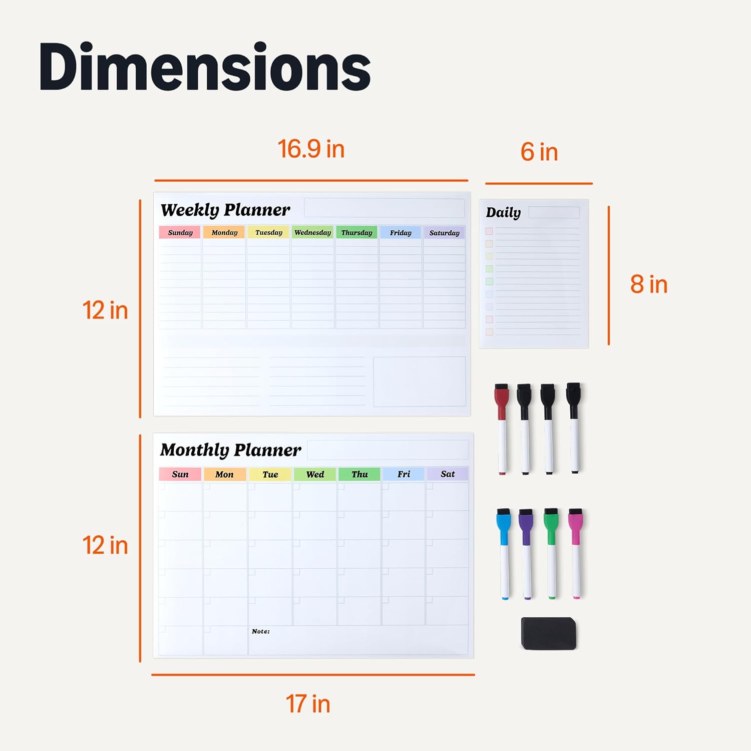 - Set of 3 magnetic dry erase calendar boards for refrigerators in daily, weekly, and monthly formats; includes markers and eraser