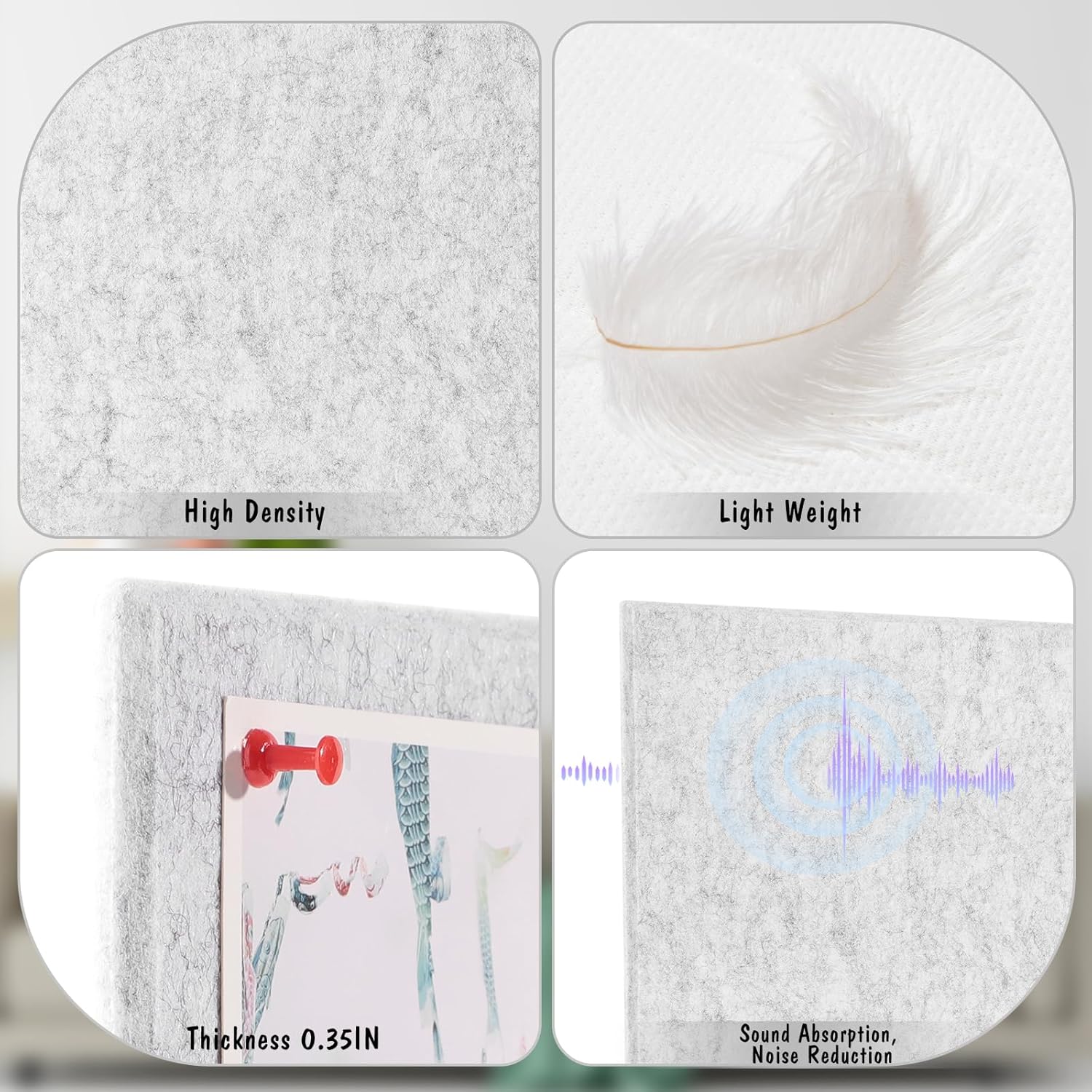 - 【Package Includes】You will receive 6 pack felt wall tiles and 1 box colorful thumbtacks (about 30pcs). The size of each felt wall tile is 11.8" x 11.8" and the thickness is about 0.35". You can splice them into the desired shape and size according to your needs, such as 36" x 24", 12" x 72", etc.