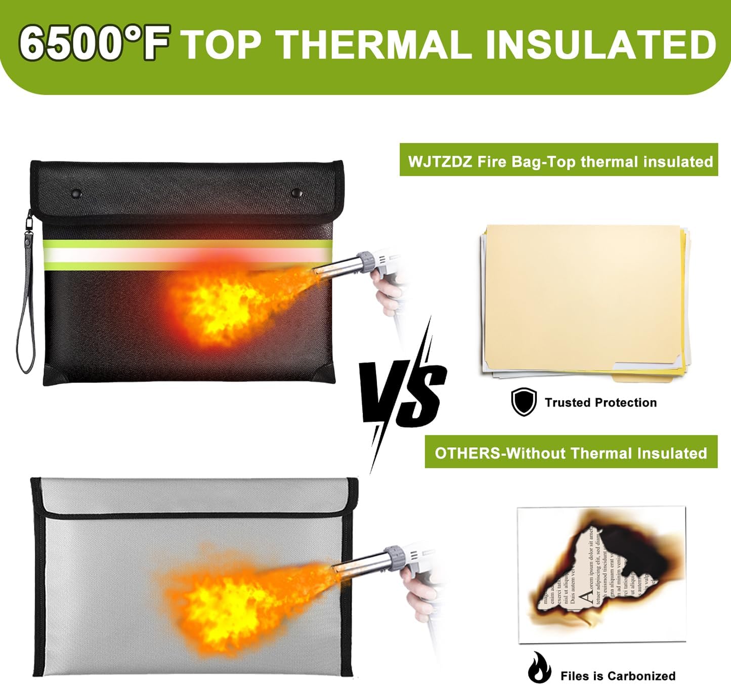 • ⚠️(Note) Fireproof does not mean it can withstand a long fire, and waterproof does not mean it can be immersed in water for a long time.It just gives you enough time to rescue your valuables. 🔥【6500°F Top Fireproof】The upgraded fireproof bag has passed the global flammability standard (US laboratory) and vertical burning test (SGS UL94 V-1) and can withstand temperatures up to 6500°F, far exceeding the typical fire temperature.