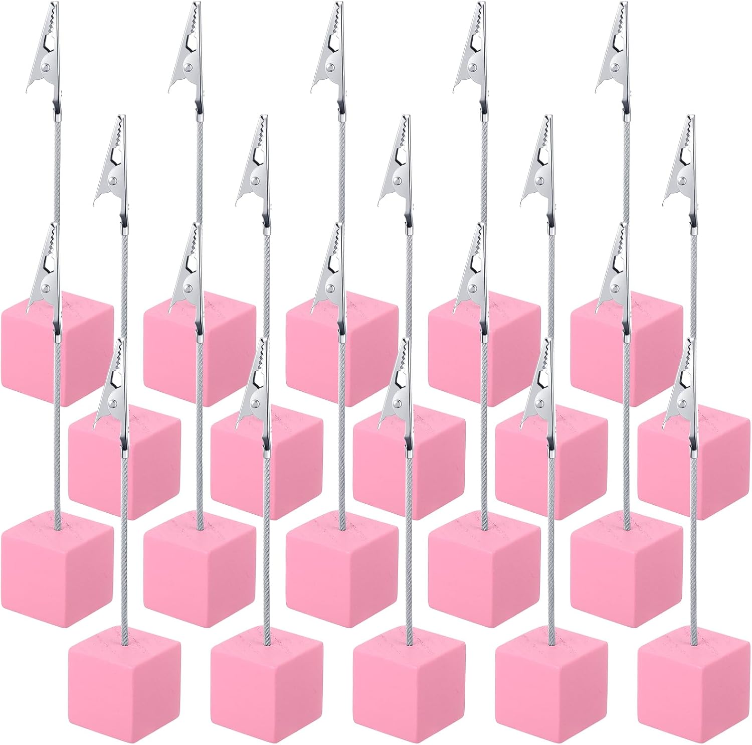 20 Pcs Cube Base Memo Clip Holder with Alligator Clip Wood Table Number Holder Cube Base Place Card Stand Mini Photo Menu Stand for Displaying Number Card(Pink)
