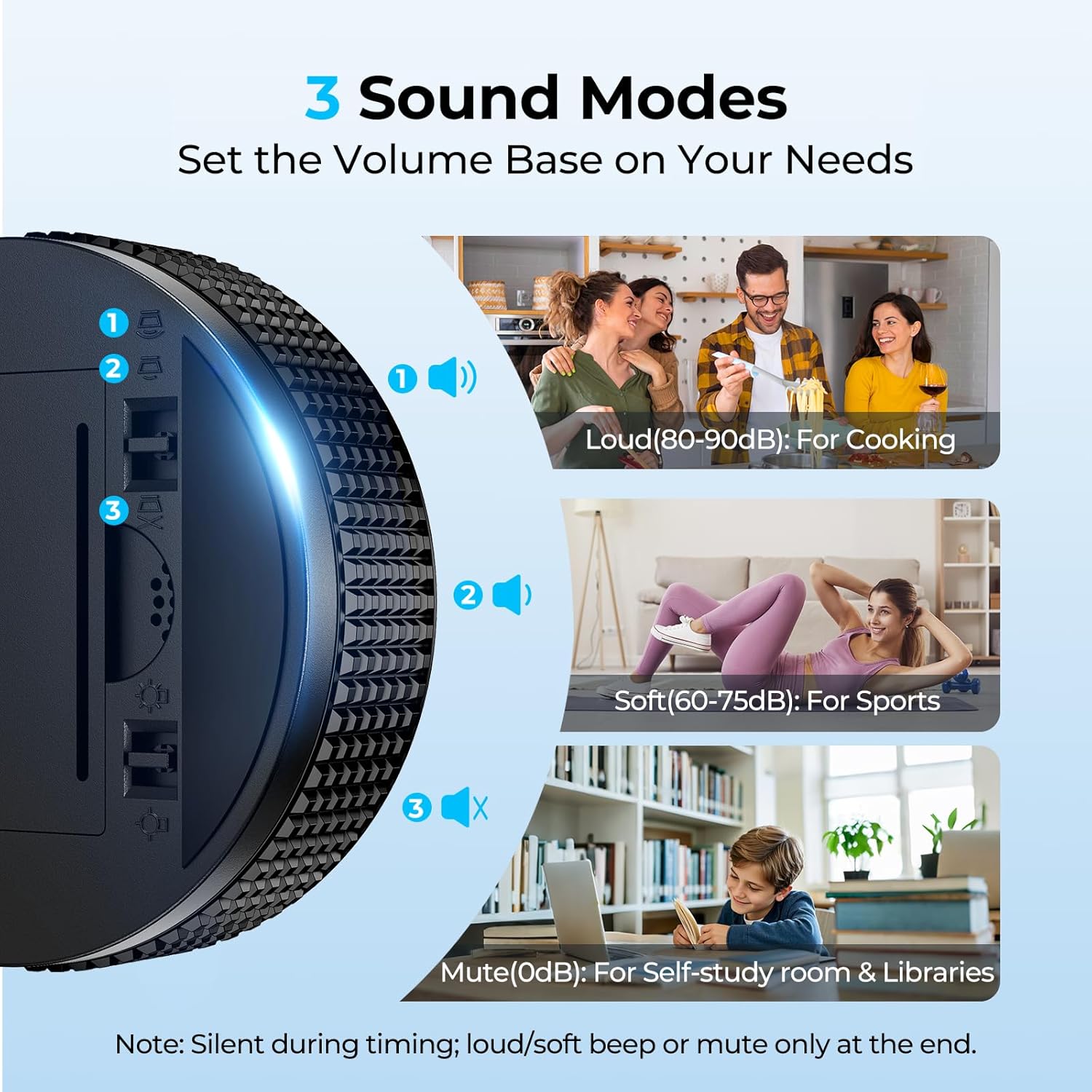 - 【Rotating Timer with Simple & User-Friendly Operation】: No more struggling with small buttons—just rotate the outer ring to set the time and press the button to start or stop. Choose from 3 volume levels: Mute (0 dB), Medium (60-75 dB), and Loud (80-90 dB) to suit your environment. The alarm can easily be heard across the room. Adjust brightness with 2 modes: Constant brightness or Energy-Saving mode (screen sleeps after 5 seconds) to fit your needs