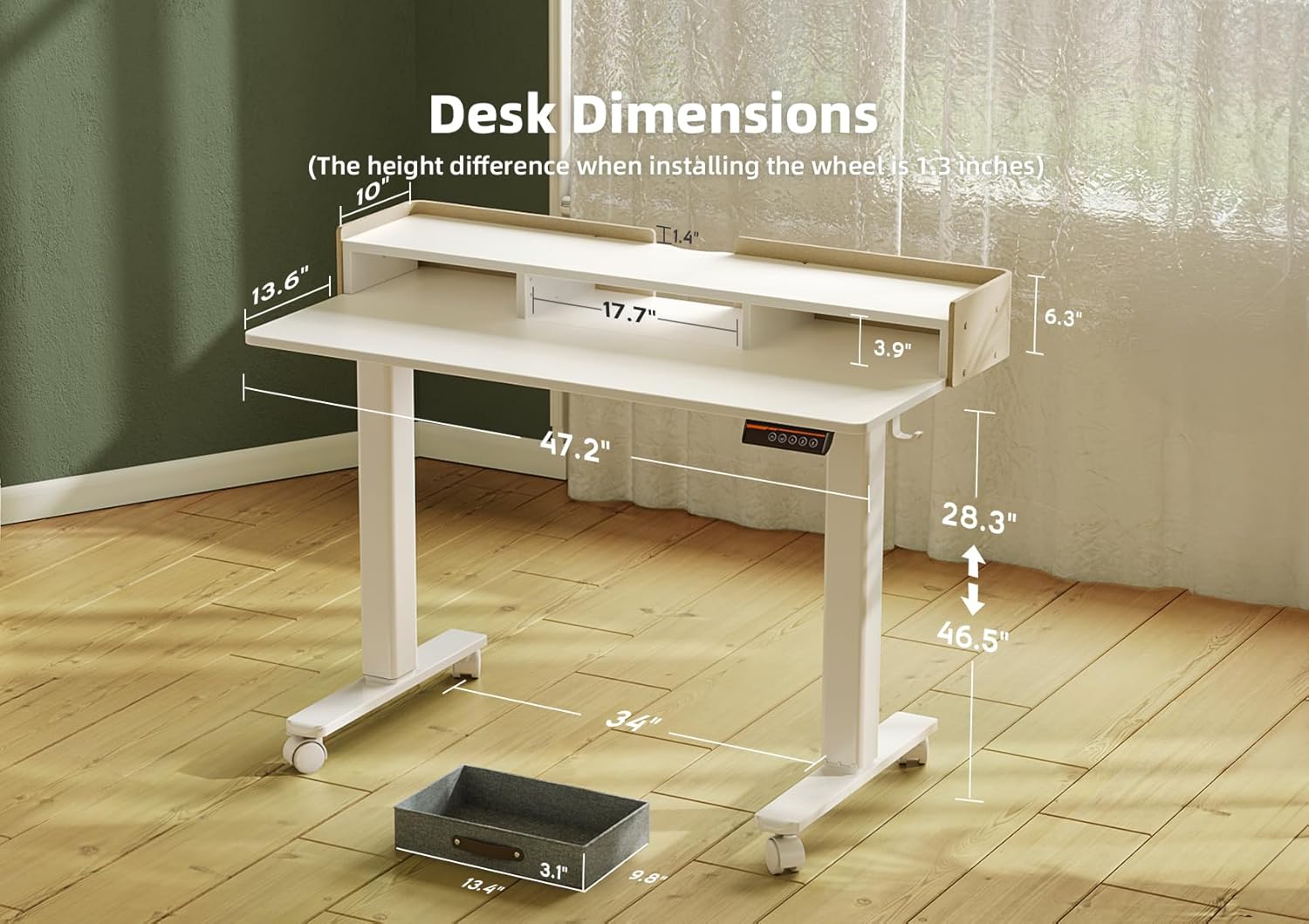 - 2-Drawers for Storage - Adjustable stand desk with drawers. 2 tabletop drawers provide more storage & organize space for a variety of home office tasks. The desk comes with a hook, drawers, and felt fence, which provides more home office desk usage possibilities.