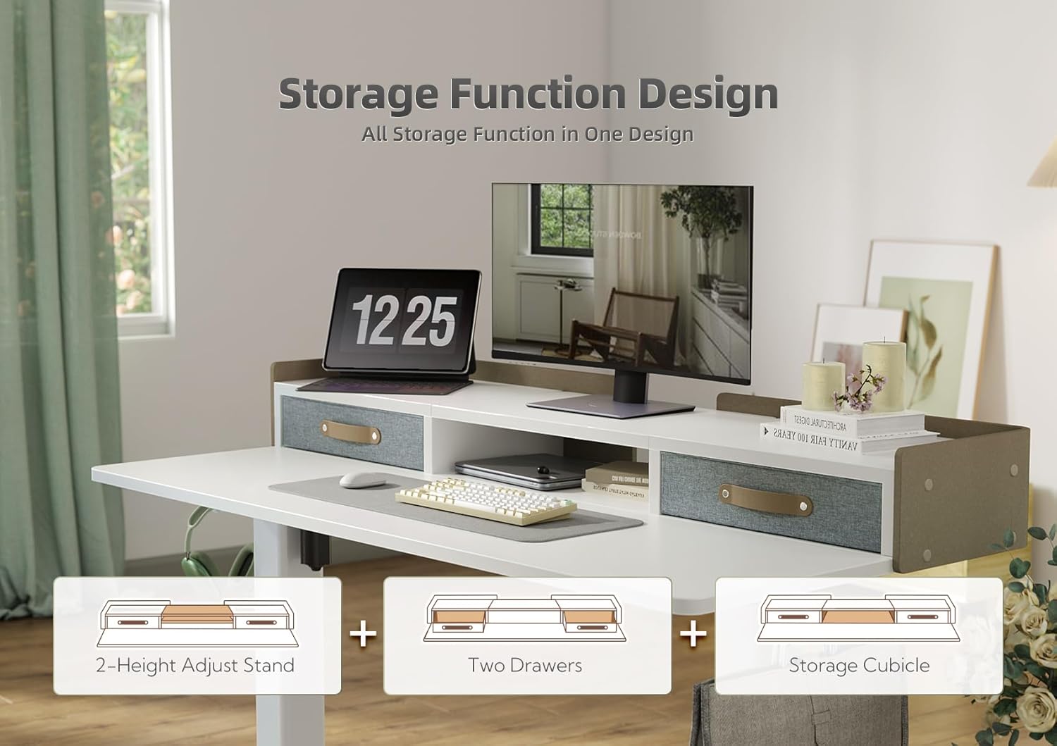- 2-Tier Adjustable Shelf Stand - YDN standing desk with storage and unique felt fence design. The mid desk top with 2 adjustable heights, provides you with a more ergonomic way to view your monitor.