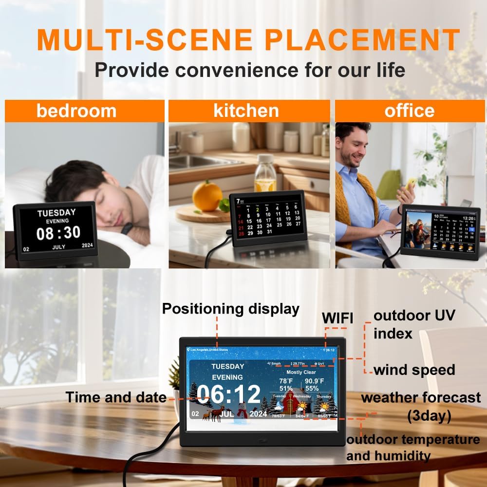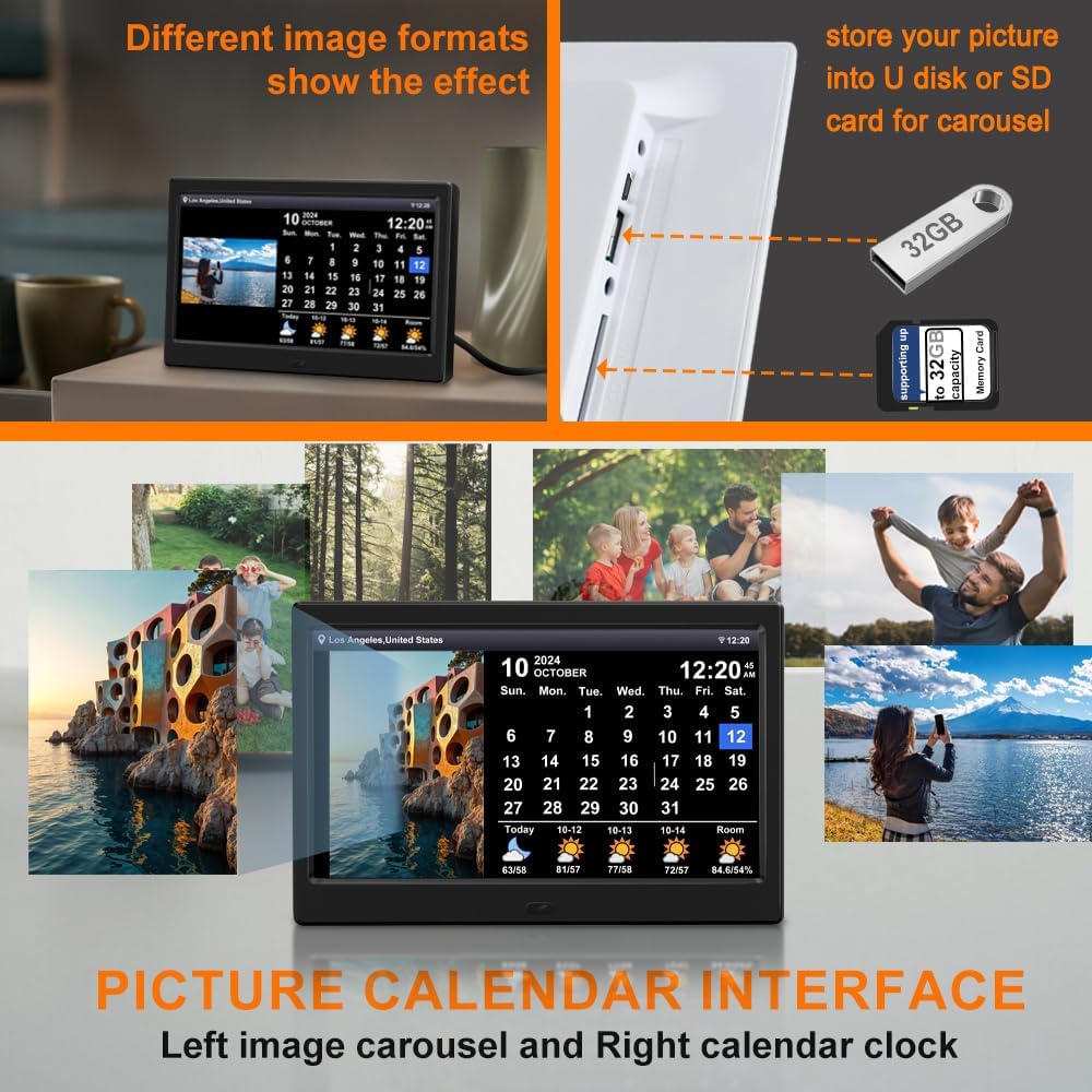 - 【12+1 Displays Interfaces】: 12 different fix display interfaces + 1 Split screen display, different interface highlighting different information to meet the needs of various users and scenarios. For example, the weather clock interface mainly provides weather forecasts, temperature, humidity information, and the time and date. The elderly clock interface features extra-large fonts, with font colors adjustable to white, green, blue, or red to suit individual preferences for color. Creative feature: split screen display, with picture carousel on the left side of the screen, allowing for dynamic playback of images from your U disk by USB, and calendar and weather information on the right side