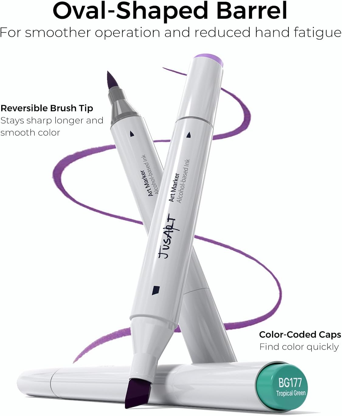 JusArt Alcohol Brush Markers, 48 Colors Dual Tip Art Markers with Brush & Chisel, Alcohol Based Marker Set for Adult Coloring Books, Drawing, Illustration, Sketching, No Bleed Ink Art Supplies