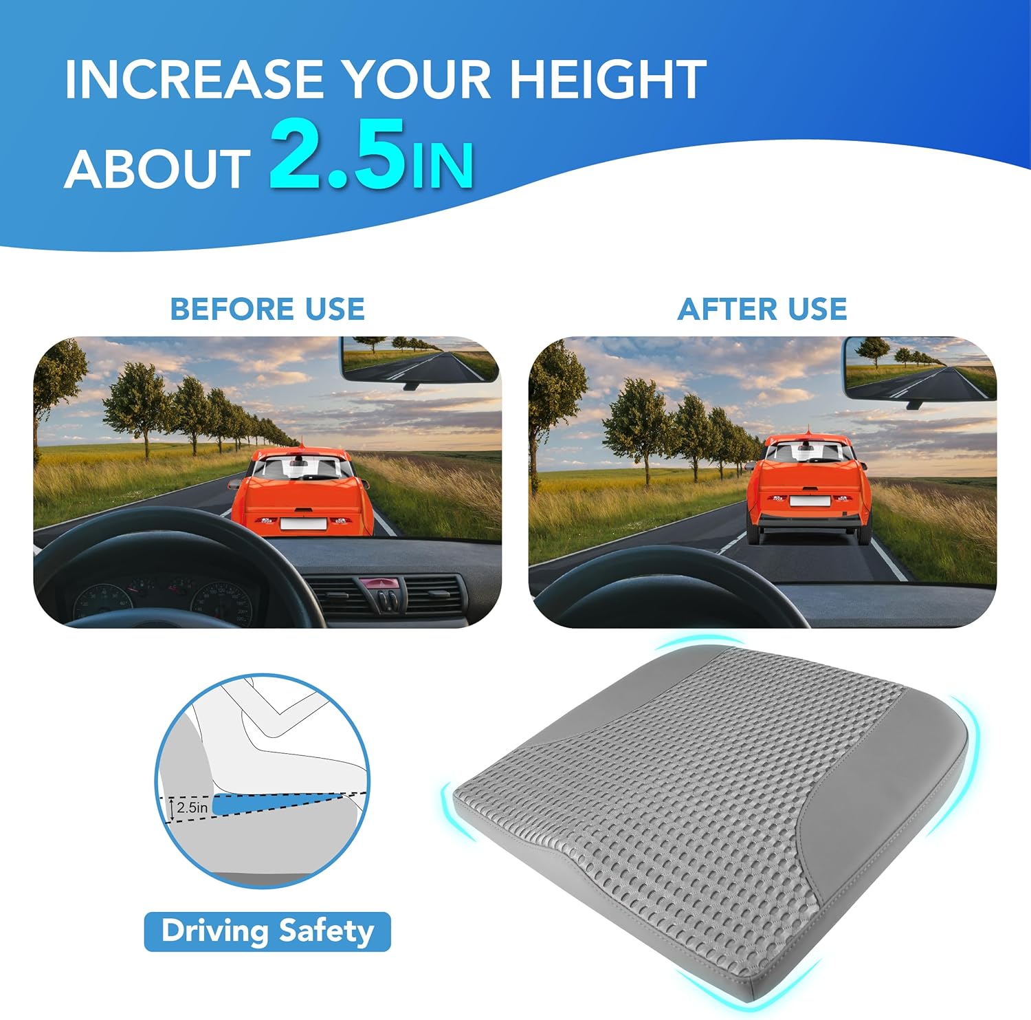 - Car Booster Seat for Short Drivers - Supportive and firm car seat cushions for short people, enhance the driver's field of vision. By raising the seat height by 2.5", it aids drivers in having a clearer view, enhancing driving safety. It offers additional comfort for long drives for truck drivers