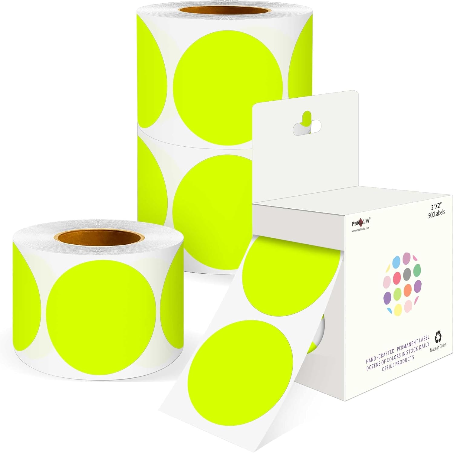 PARLAIM 2 inch Round Color-Code Dot Sticker Labels, 4 Rolls 2000 Adhesive Label Pack in Dispenser Box, Fluorescent Yellow