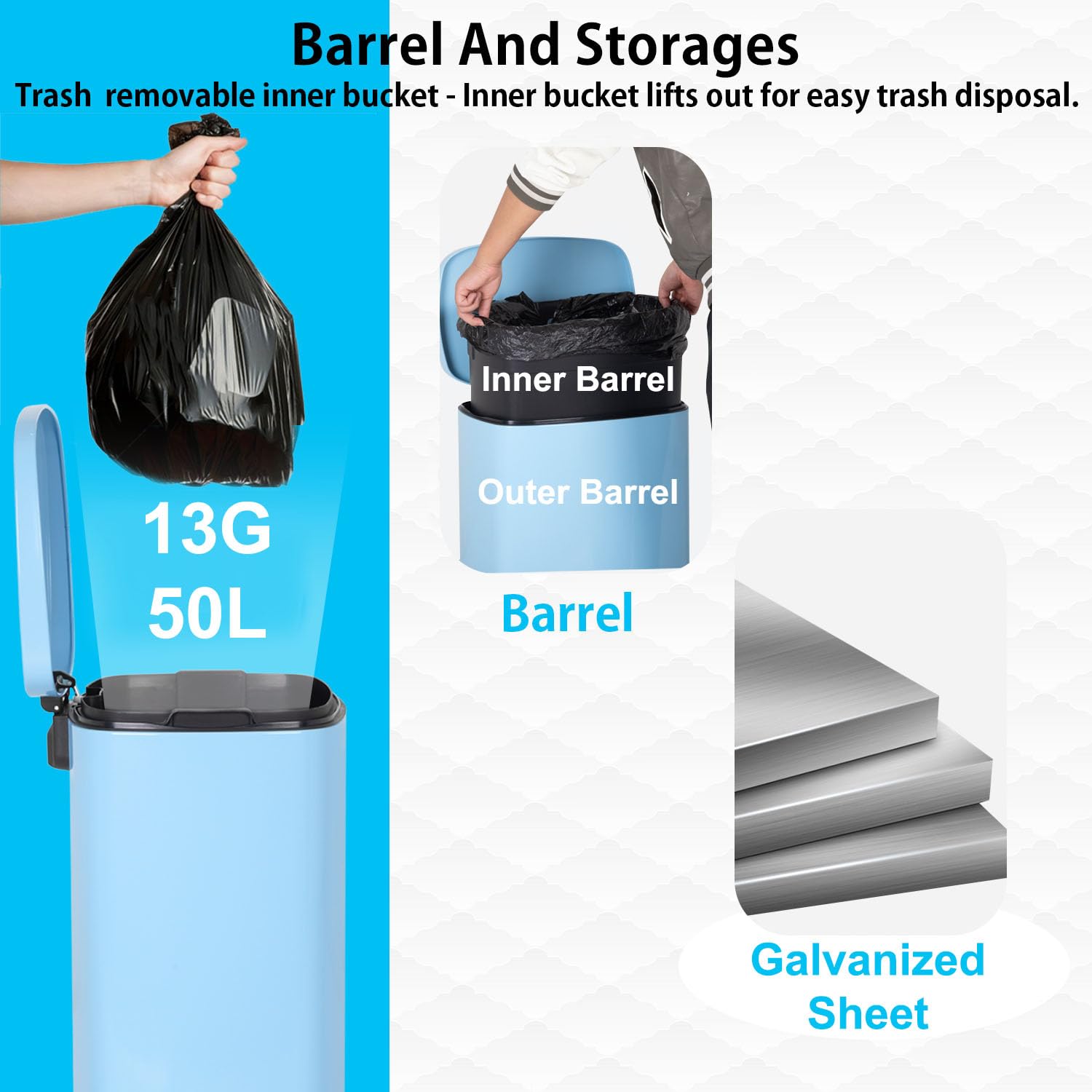 - 13 Gallon Ultra-large Capacity: 13 gallons can absolutely meet your daily use, in the kitchen table next to a kitchen trash can, you will be more convenient to deal with kitchen waste. The regular 13-gallon garbage bag in the supermarket can be used in our stainless steel trash can, and it's kind of you to use a bigger bag. The lid of the garbage can is removable, itβs convenient for you to put in and take out the garbage bag.step trash can kitchen trash can bedroom trash can