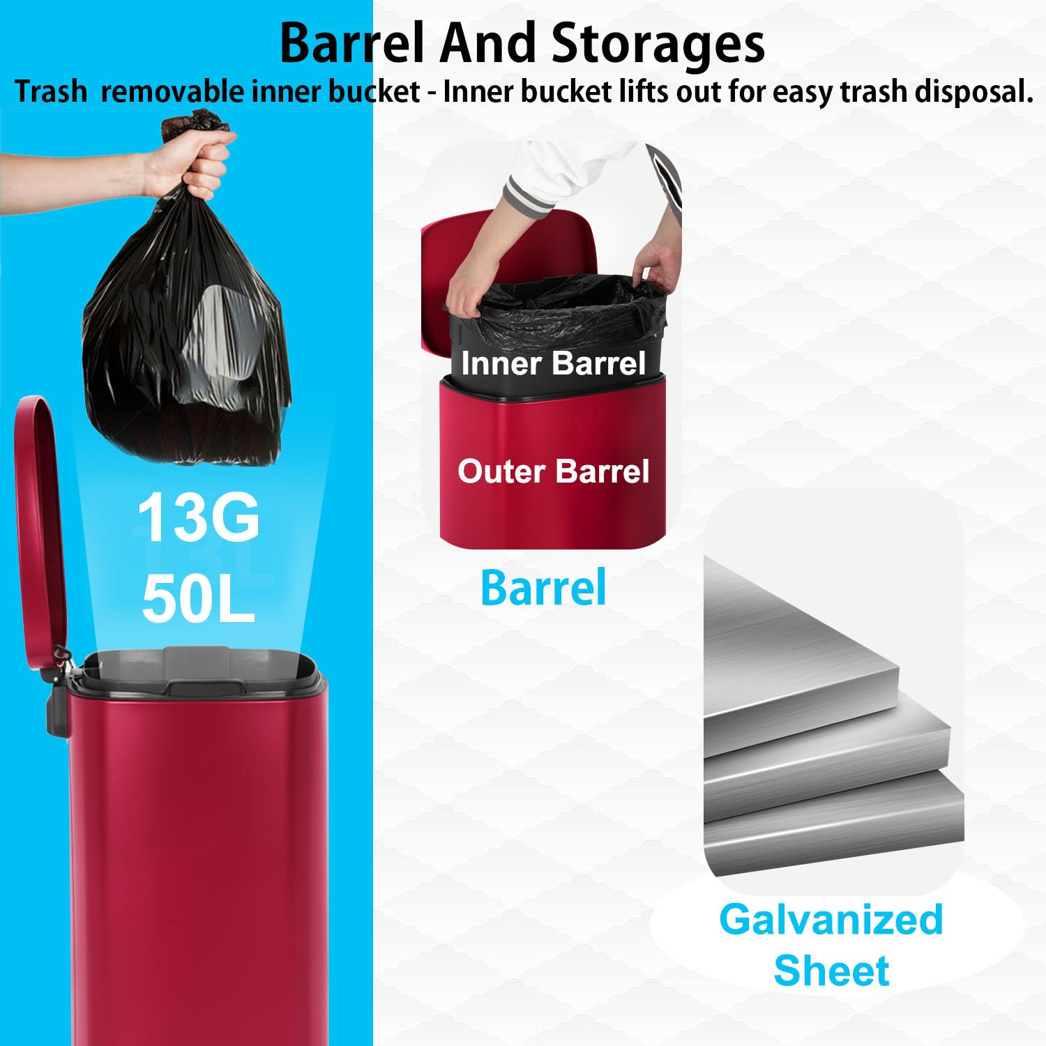 - 13 Gallon Ultra-large Capacity: 13 gallons can absolutely meet your daily use, in the kitchen table next to a kitchen trash can, you will be more convenient to deal with kitchen waste. The regular 13-gallon garbage bag in the supermarket can be used in our stainless steel trash can, and it's kind of you to use a bigger bag. The lid of the garbage can is removable, itβs convenient for you to put in and take out the garbage bag.step trash can kitchen trash can bedroom trash can