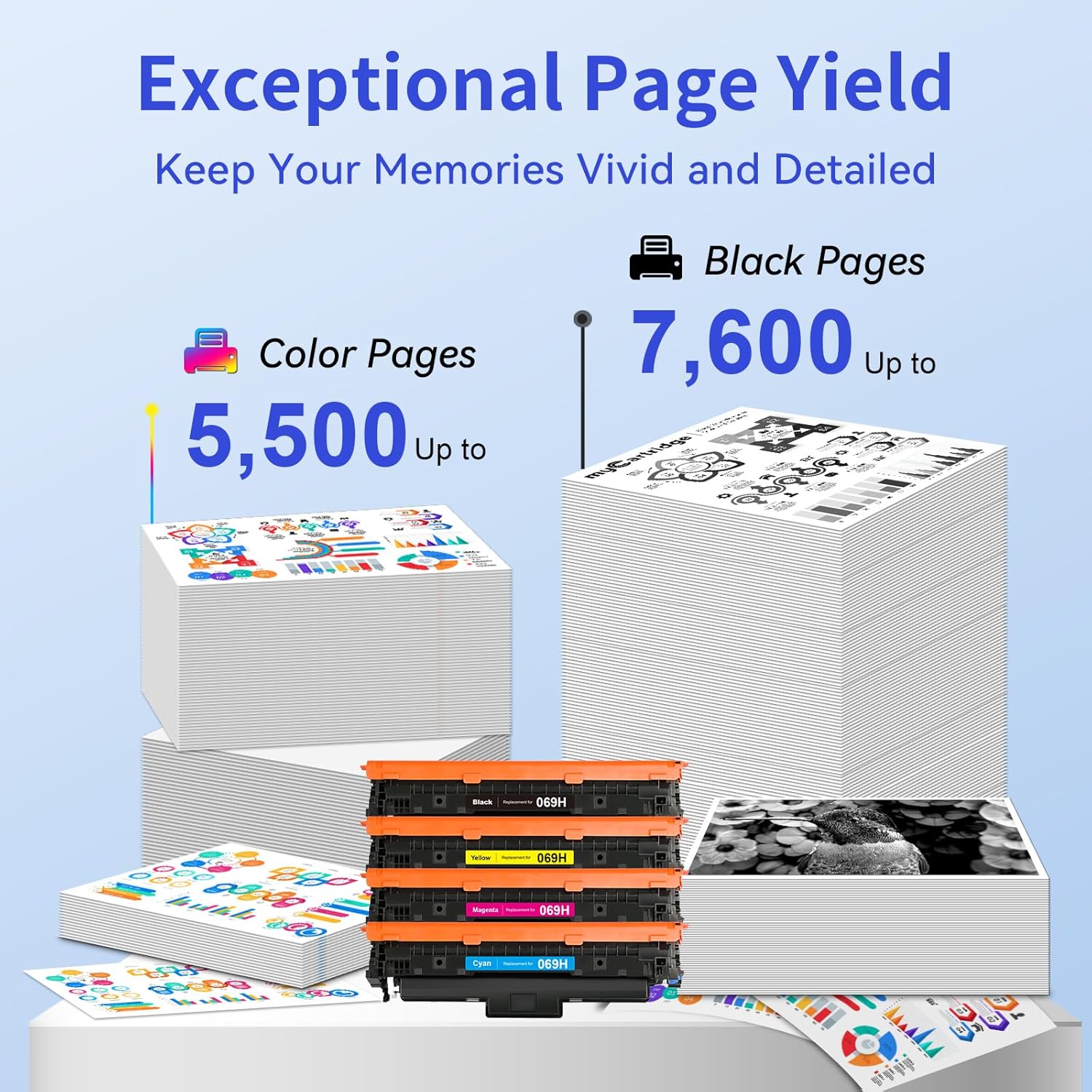 - High Page Yield: Up to 7,600 pages per 069H black toner cartridge, Up to 5,500 Pages per 069H cyan magenta yellow toner cartridge at 5% coverage of A4 Paper