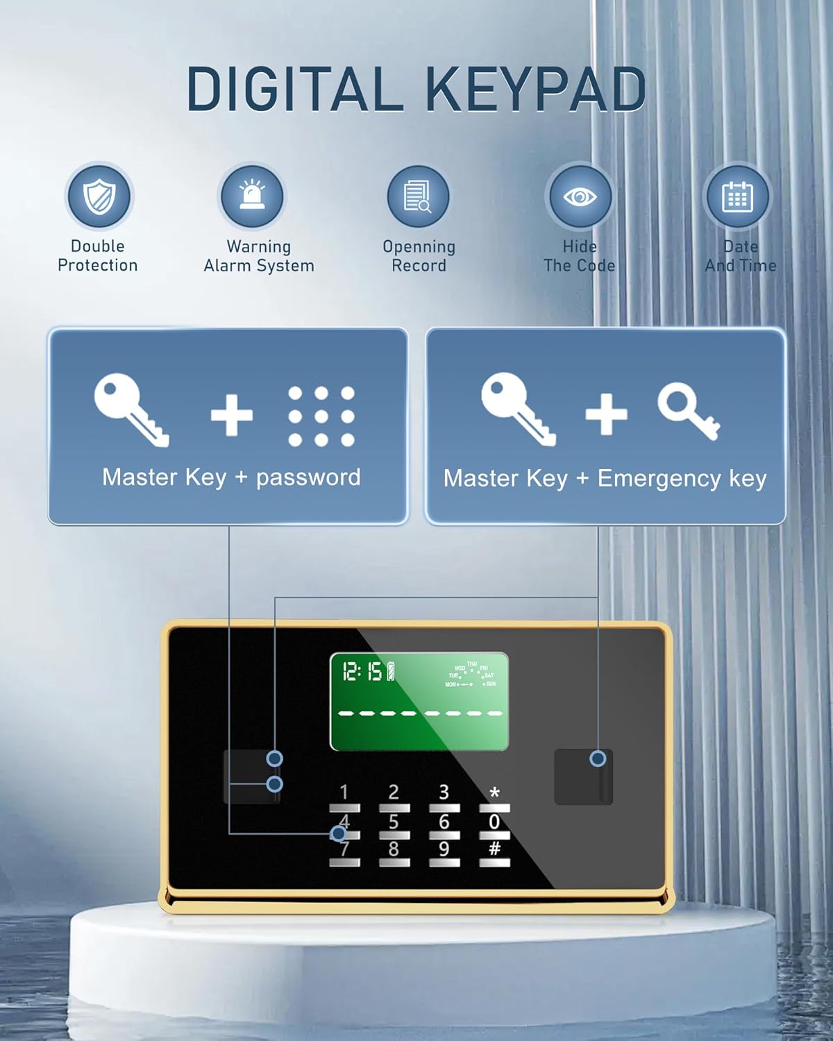 - ใEnhanced Dual Key Securityใ๏ผTigerking safe has a dual safety key unlocking function, dual key unlocking increases security. Two methods are available for unlocking: 1. Dual key unlocking; 2. Master key + password unlocking, NOTE: The master key is always needed to open the safe, with this design, even if someone gets your code, without the master key, they still can not access the safe.