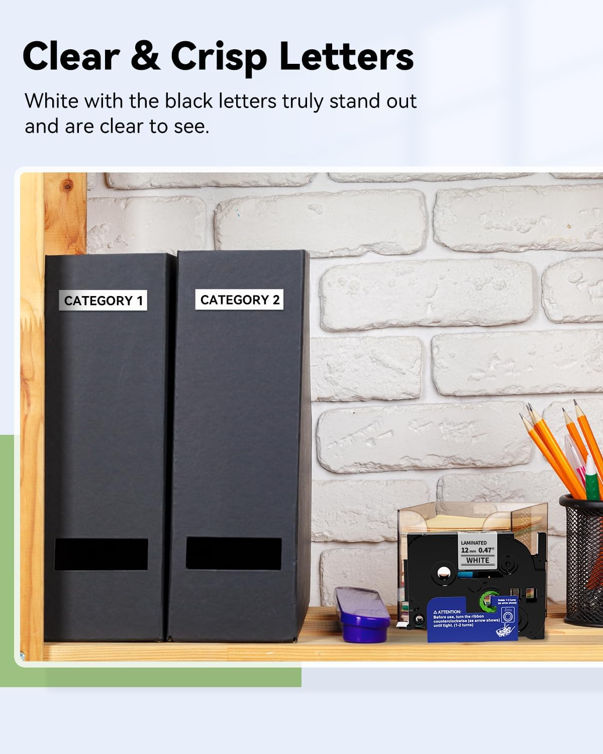12mm 0.47 Laminated White Tape Tze Tz Label Compatible with Brother P-touch 1/2 Inch Black on White P Touch Label Maker TZe231 for PT-D210 1280 1750 PT-P300BT PT-P700BT Cube Plus Tape, 10-Pack