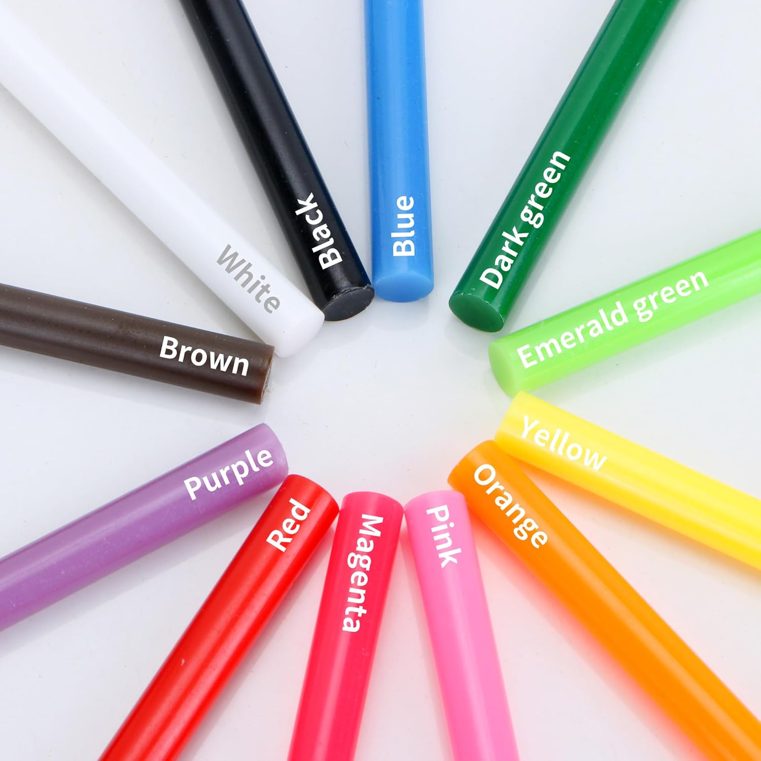 - Colored Glue Sticks Value Pack: 96 pcs 12 Colors hot glue Sticks Mini Size, 7mm/0.27 inch diameter and 100mm/4 inchs glue sticks tool, compatible with most glue guns on the market.