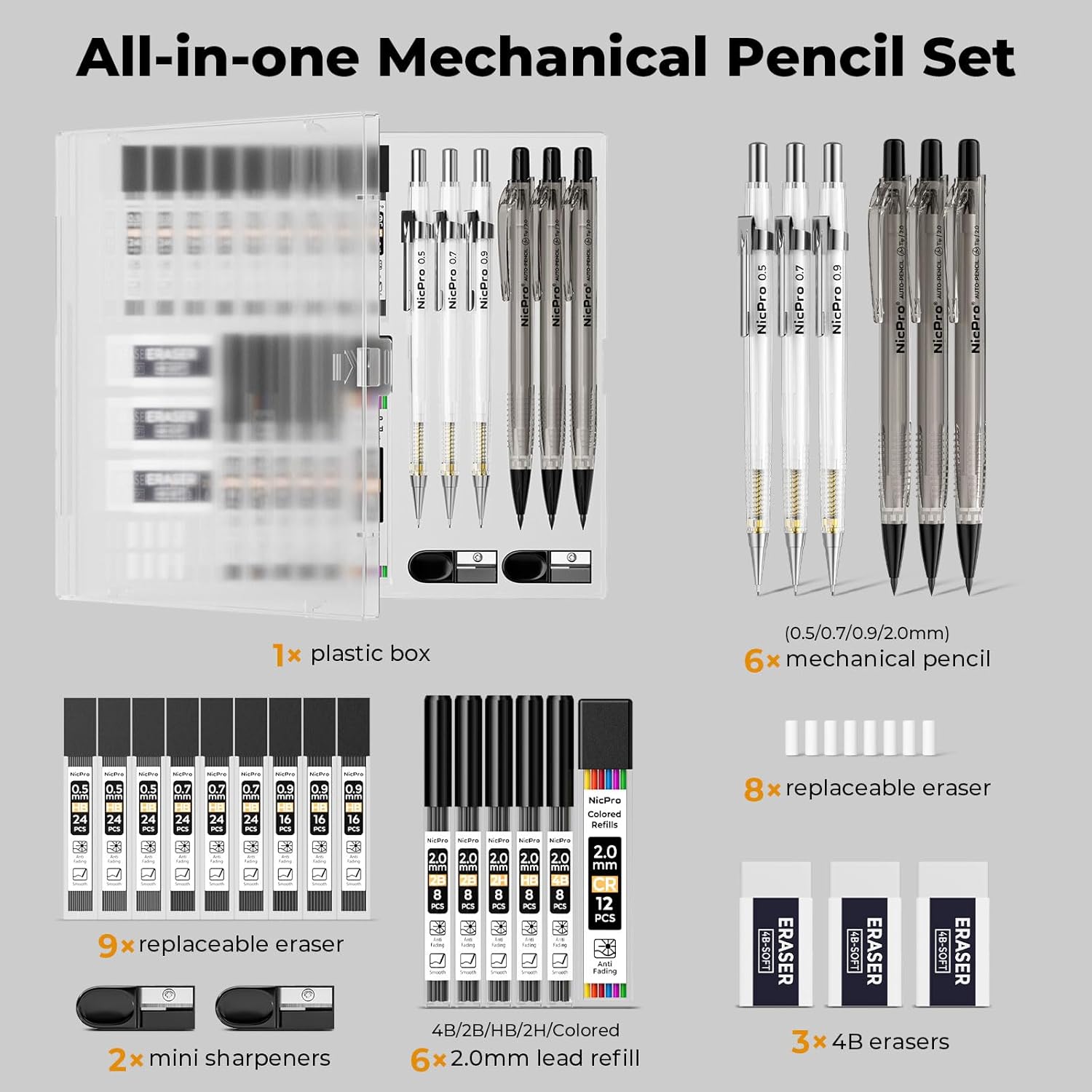 - All in One Drawing Supplies:Come with 6 PCS drafting pencils and 9 tubes of lead refill in 0.5 mm & 0.7mm & 0.9mm (HB) + 4 tube 2.0 mm(4B, 2B, HB, 2H) carbon based , 3 pcs 4B erasers, 2 lead sharpener, 8 pcs eraser refills, a storage case