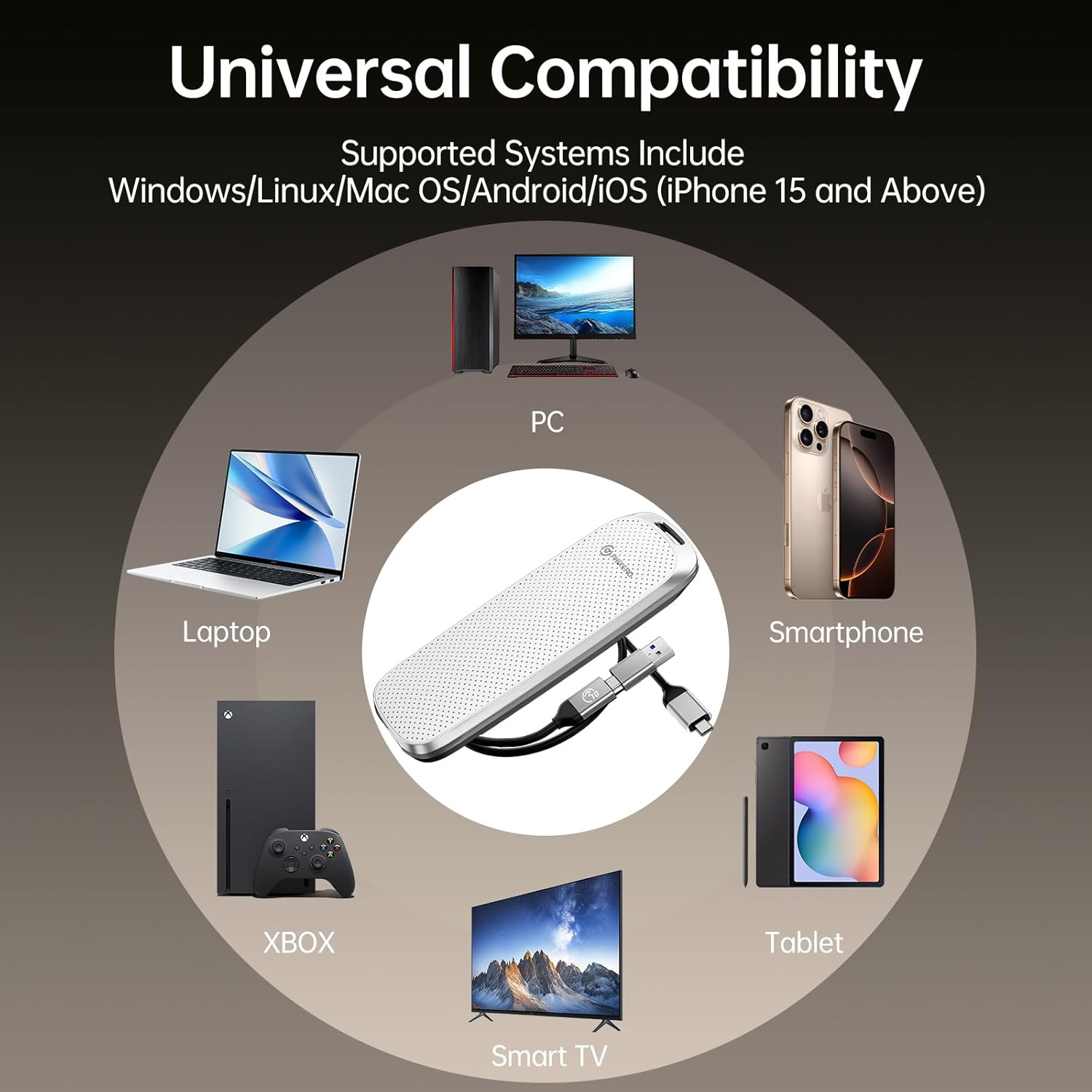 - UNIVERSAL COMPATIBILITY, ZERO CONFIGURATION: Features a reversible Type-C interface and includes a high-quality 0.3m 2-in-1 USB C to USB C & USB A cable. Plug and play support for iPhone 15 & newer, Android, Windows, Mac OS, Linux, with no drivers required. Perfectly for laptops, tablets, smartphones, cameras, gaming consoles and more.