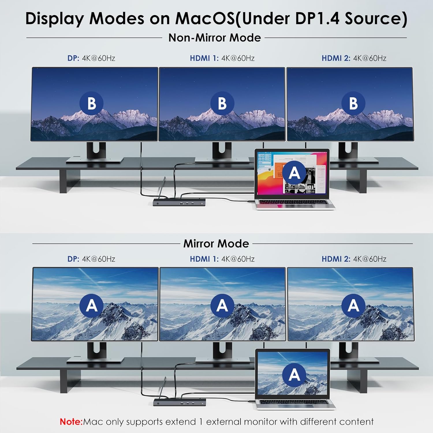 - 8K Ultra HD & Triple Display: Take your visual experience to the next level with our USB C dock. Equipped with dual HDMI and DP ports, it supports up to triple 4K@60Hz video output for Mac users (Under DP1.4). Single 8K@30Hz is only available for Windows PC via the DisplayPort. Ideal for video editors, image designers, game players etc. NOTE: Some Windows laptops only support 3 monitors(including the host screen) due to their graphic card limitations