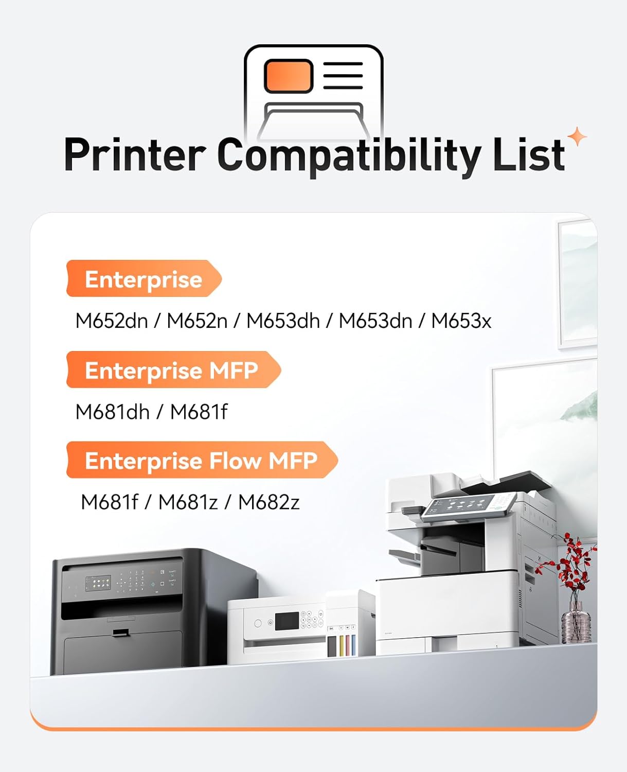 - Compatible Devices : Compatible for HP Color LaserJet Enterprise Flow MFP M681f, M681z, M682z; HP Color LaserJet Enterprise M652dn, M652n, M653dh, M653dn, M653x; HP Color LaserJet Enterprise MFP M681dh, M681f Series Printer. Compatible for HP Color LaserJet Enterprise Flow MFP M681f, M681z, M682z; HP Color LaserJet Enterprise M652dn, M652n, M653dh, M653dn, M653x; HP Color LaserJet Enterprise MFP M681dh, M681f Series Printer.
