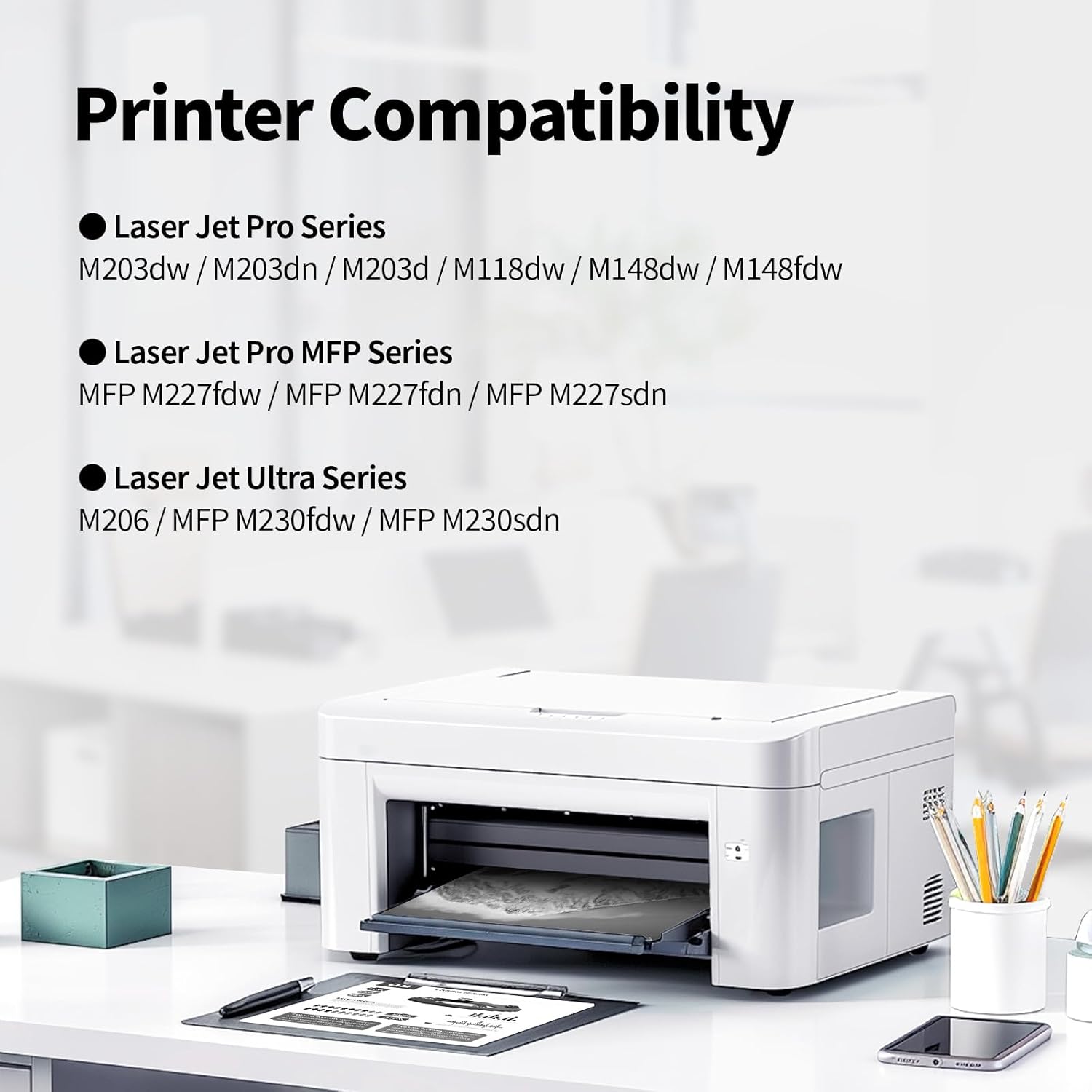 - Printer Compatibility: Laser Jet Pro Series: M203dw / M203dn / M203d / M118dw / M148dw / M148fdw; Laser Jet Pro MFP Series: MFP M227fdw / MFP M227fdn / MFP M227sdn; Laser Jet Ultra Series: M206 / MFP M230fdw / MFP M230sdn