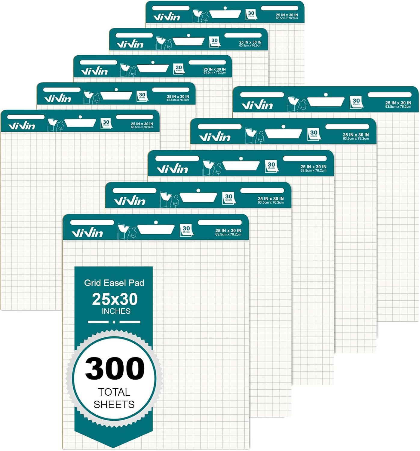 ViVin Grid Sticky Easel Pad, 25 x 30 Inches Flip Chart Paper for Teachers and Students, Large Self Stick Easel Paper for School & Office, 30 Sheets/Pad, 10 Pads/Pack