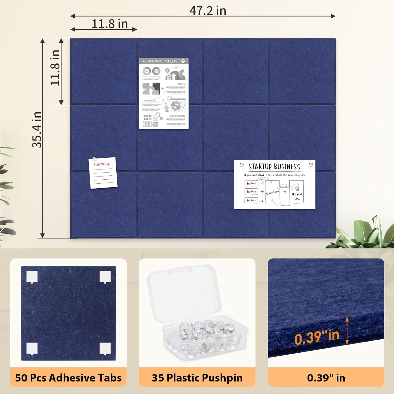 - 【Large Cork Board Set】:Our felt wall tiles includes 12 pieces of 11.8"x11.8"/30x30 cm, 0.35" thick high-density felt pin board, 50 pieces of removable adhesive tabs and 35 push pins that can be customised to any size you need, e.g. 48" x 36", 72" x 48", 96" x 48" etc.