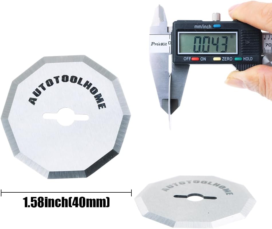 - DIMENSION----1.58 inches (40 mm), thickness: 0.043 inches ,Package includes 2pcs Replacement Rotary Blades with storage case, not including the electric scissors