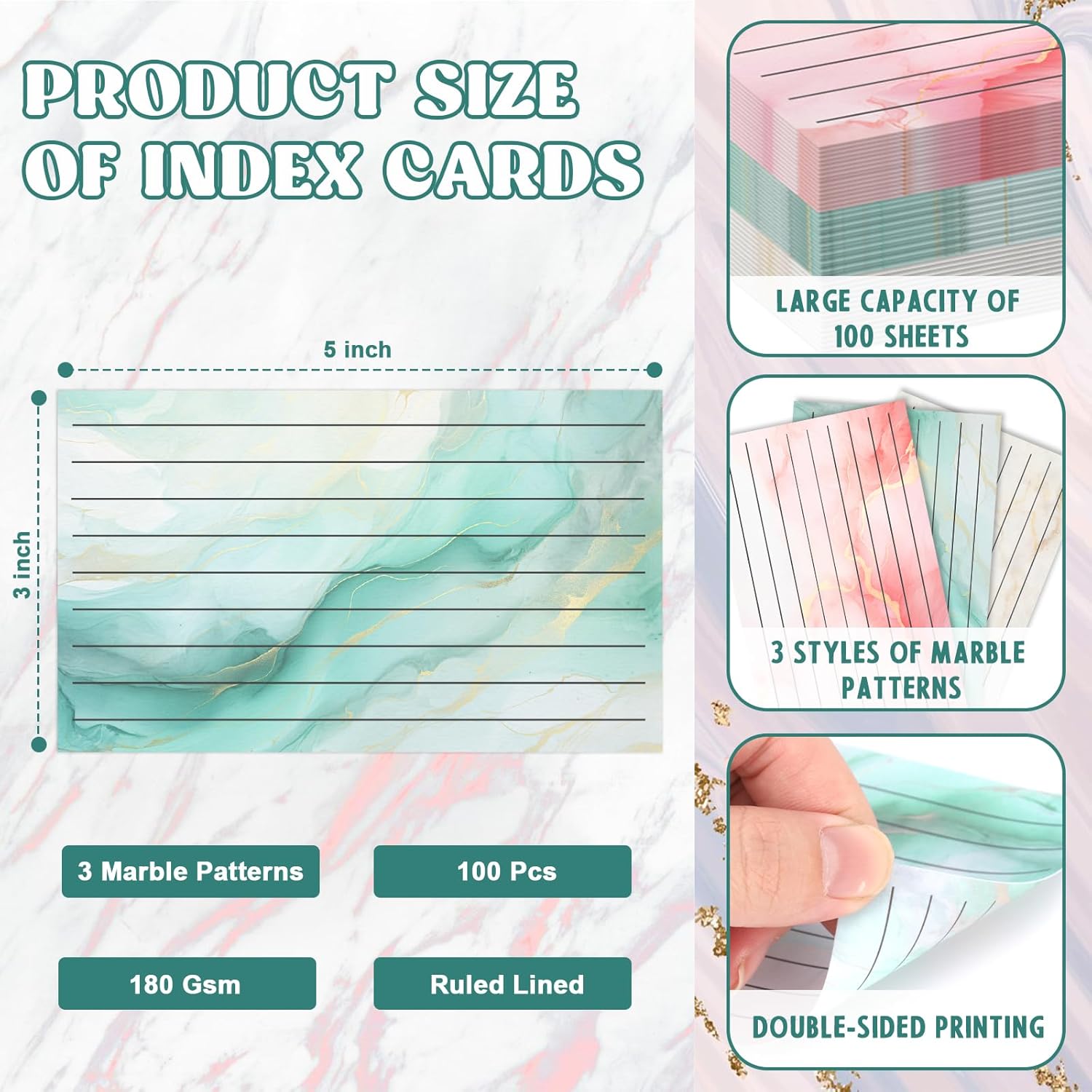 100 Pack Colored Index Cards 3x5 Marble Notecards Lined FlashCards for Studying Heavy Note Cards 180 gsm Memo Cards for Office Home School Supplies