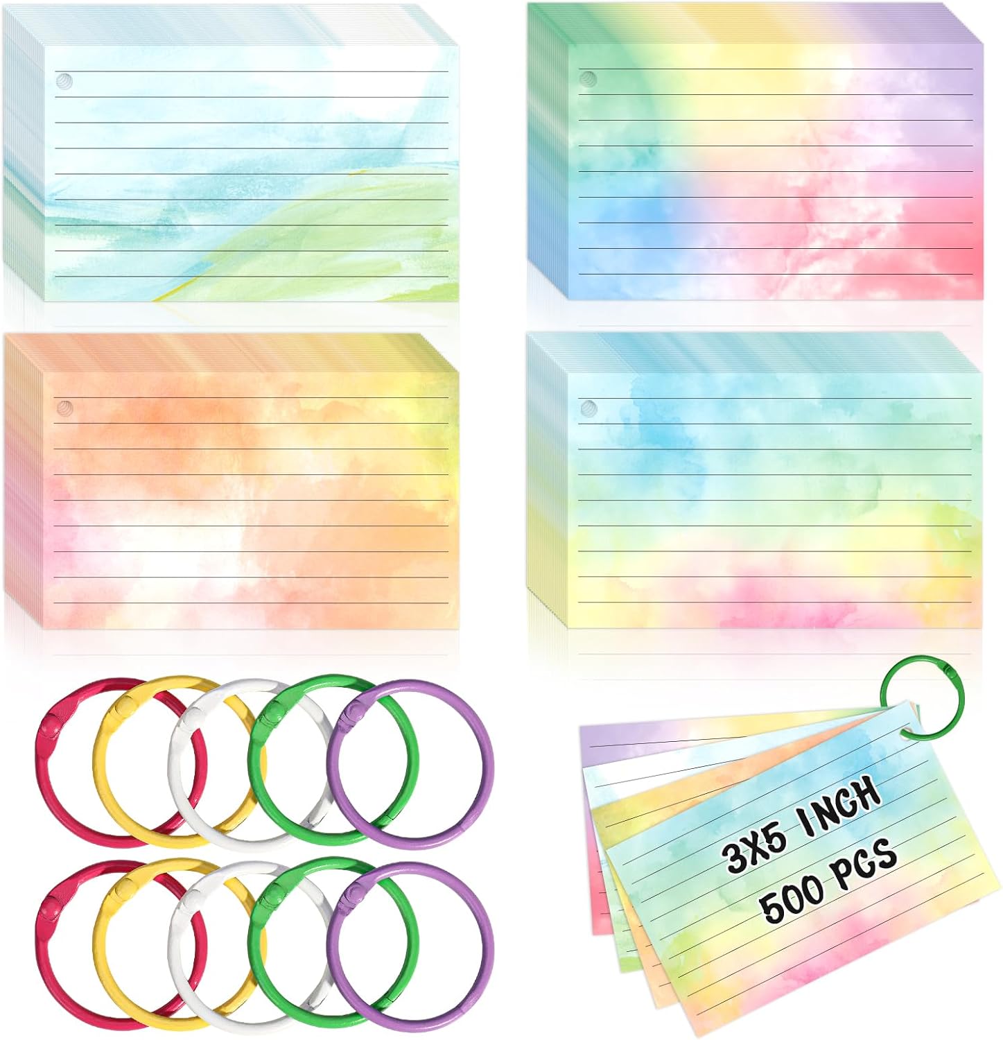 500 PCS Colored Index Cards with Hole Lined Flash Cards with Binder Rings Watercolor Notecards with Rings 3x5 Study Cards Flashcards for Home School Office Supplies