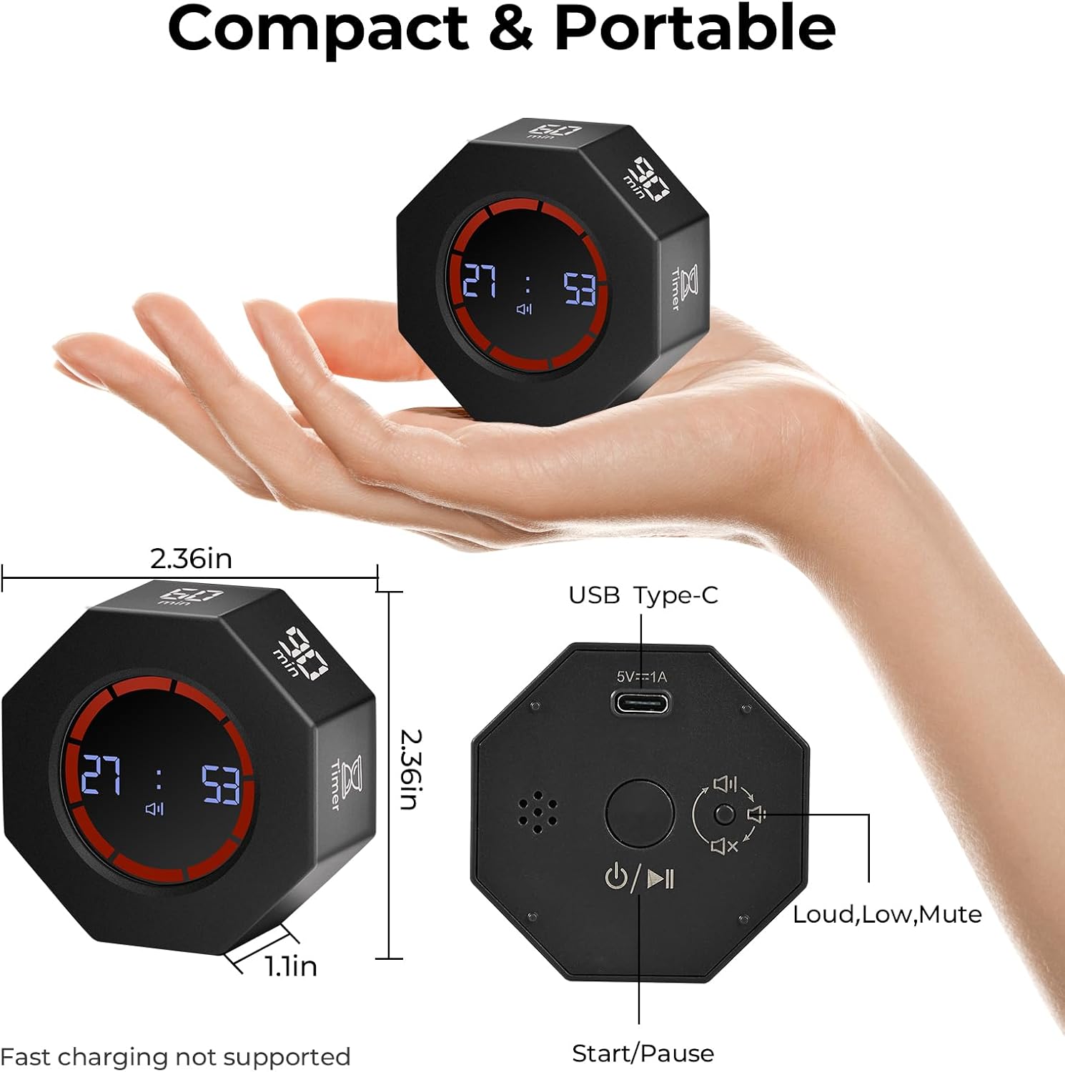 - Rechargeable Timer : This smart productivity timer uses Type-C charging for low power consumption and long battery life. With a full charge, it provides over 24 hours of continuous timing and 180 days of standby. Fast charging is not supported.