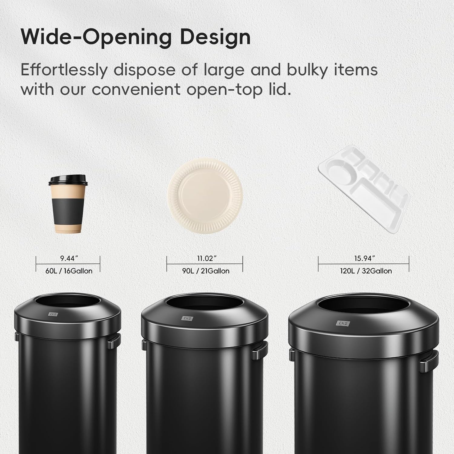 EKO Urban 24 Gallon Round Black Stainless Steel Open Top Waste Bin, Tall Commercial Trash Can for Indoor/Outdoor, Extra Large Metal Garbage Bin for Office, Restaurant, Restroom, 90L