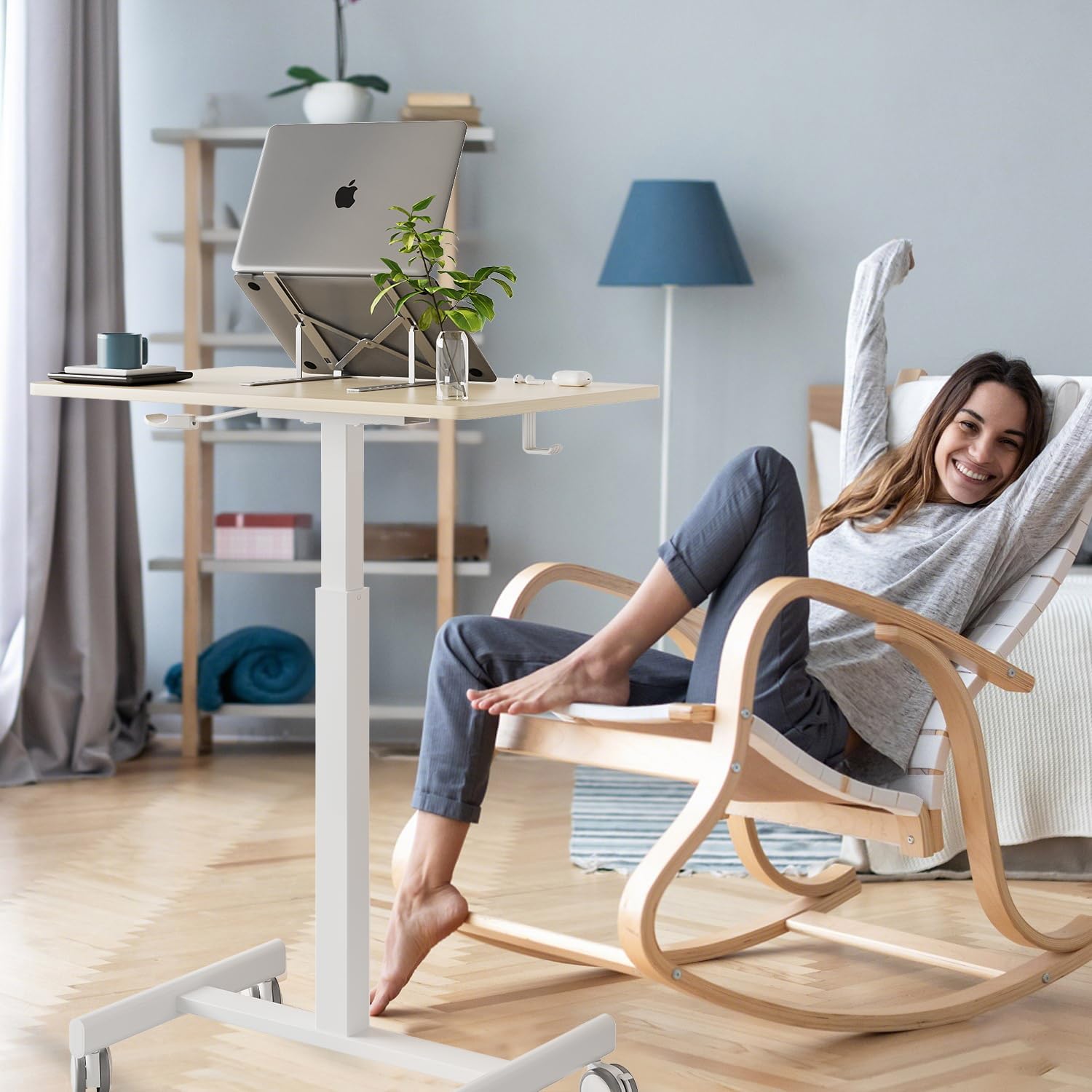 Mobile Small Standing Desk, Gas Spring Adjustable Height Rolling Portable Laptop Desk with Lockable Wheels, Computer Workstation, Rolling Podium (Maple Top + White Frame, 18 * 26)