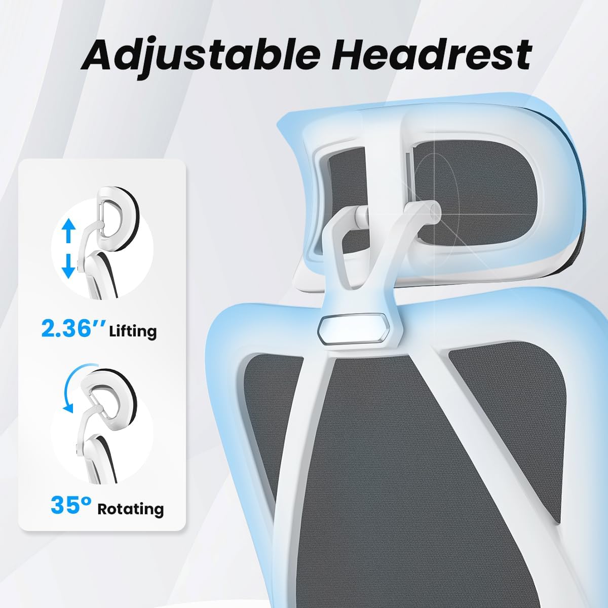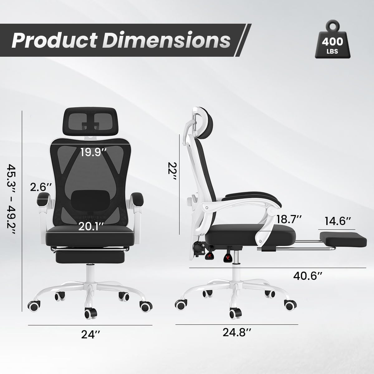 Farini Ergonomic Office Chair with Footrest, Mesh Office Desk Chair with Headrest, High Back Computer Chair with Adjustable Lumbar Support for Home Office Study Room Bedroom, White & Black