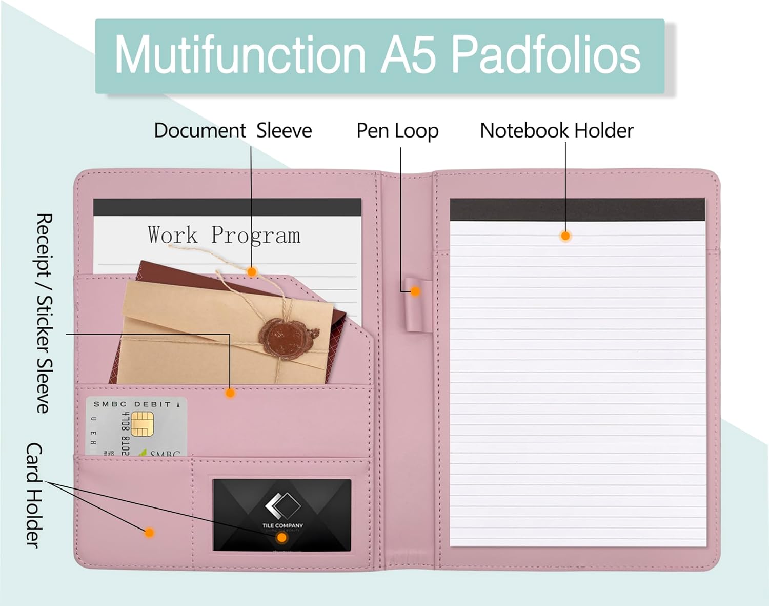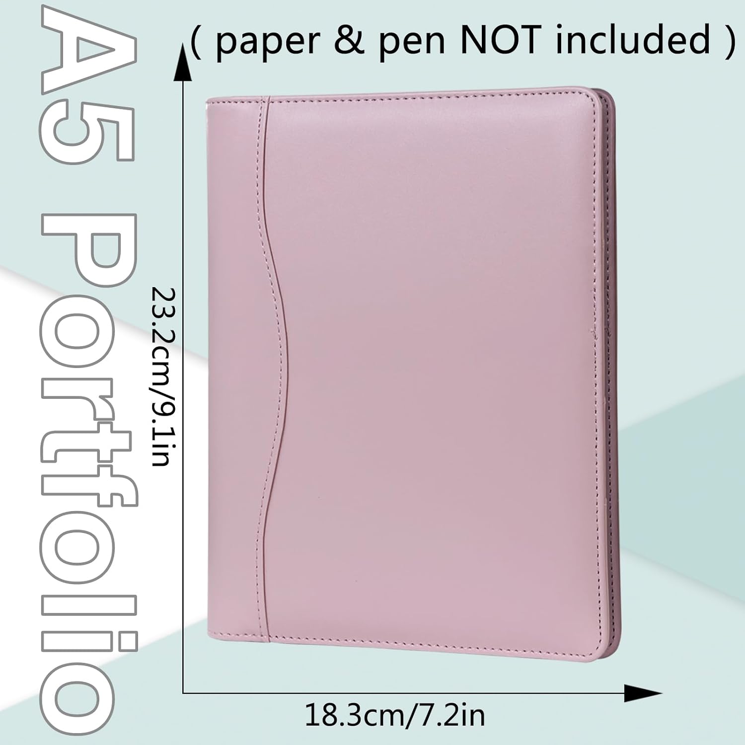 Leather Portfolio Binder 5 x 8, Mini Soft Leather Padfolio A5 Business Binder Legal Writing Pad Junior Size Document Organizer for Present Gift Kid Men Women Pink