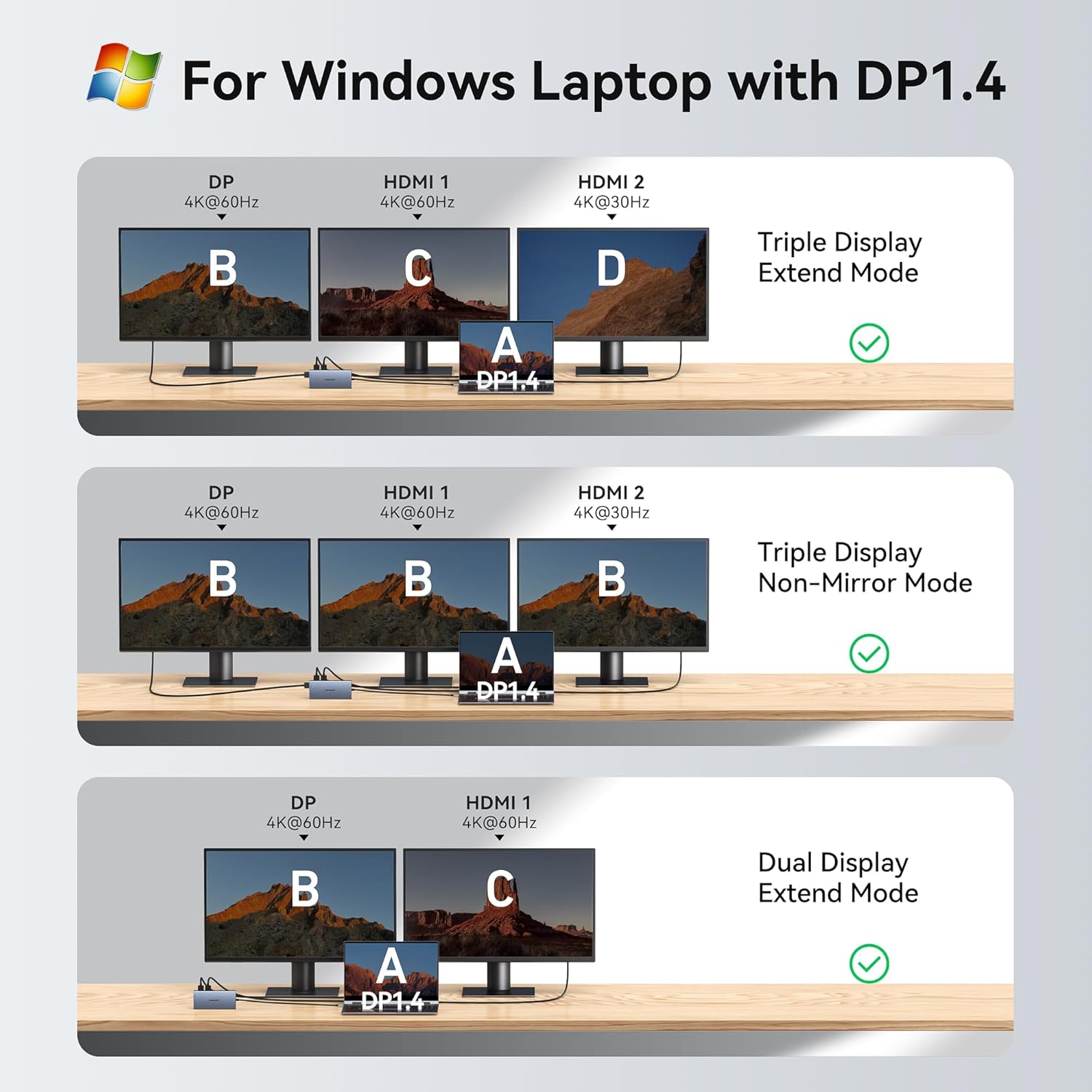 - Triple Screen & Dual 4K Display: With this usb c hub multiport adapter, turn your USB-C laptop (Dell/HP) into a powerhouse with 3-monitor support; ✨When use alone(DP 1.4), Displayport up to 8K@30Hz/4K@144Hz, HDMI port up to 4K@60Hz; Built for creators needing HDMI 2.0 + DP1.4 ports to juggle 8K editing and multi-tasking workflows. Pls note: macOS only supports mirroring mode (SST)