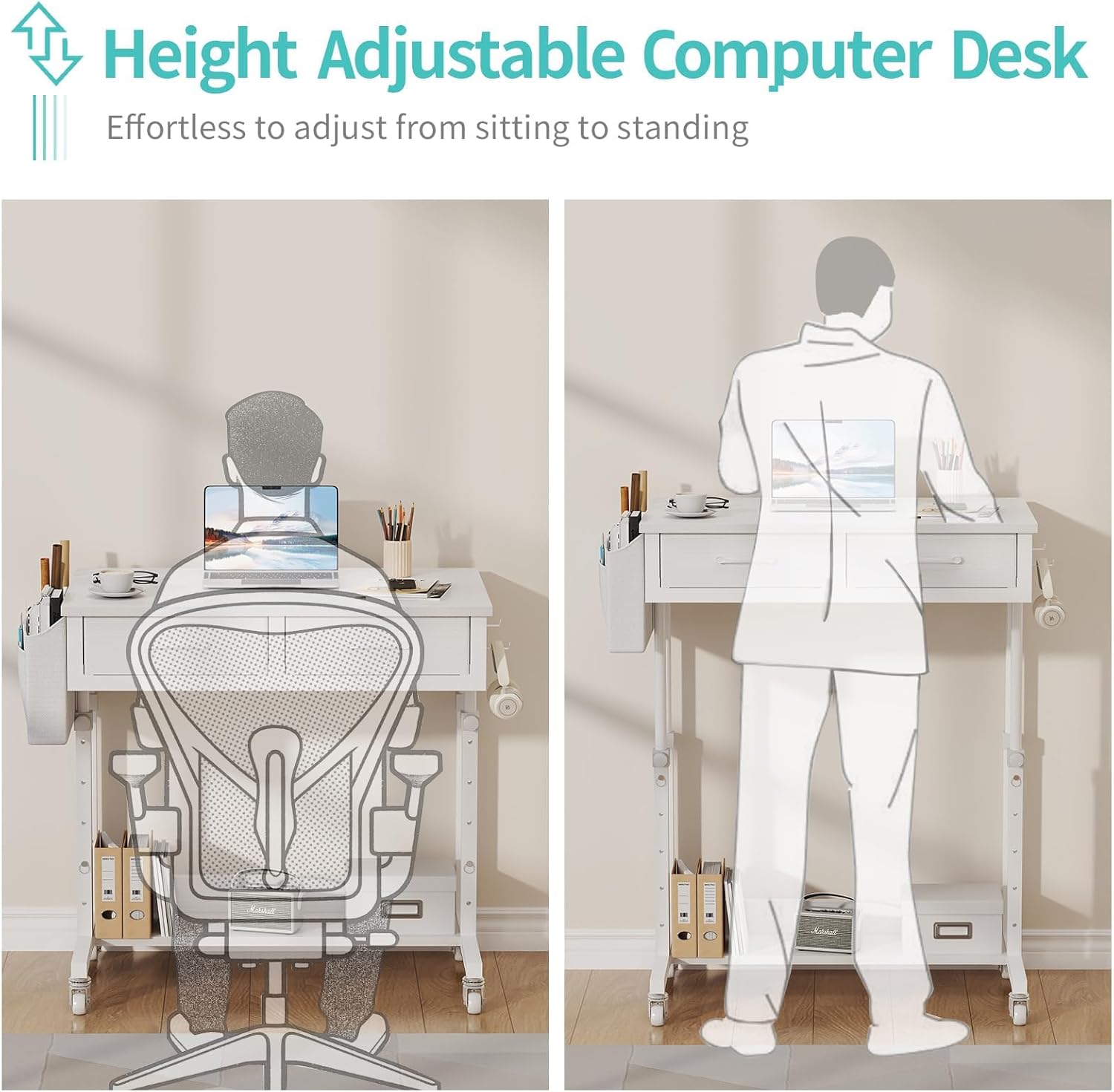 Small White Portable Rolling Desk - 32 Inch Adjustable Mobile Standing Teacher Desks with 2 Fabric Drawers on Wheels, Couch Sofa Side Laptop Table with Storage for Bedroom Home Office, White