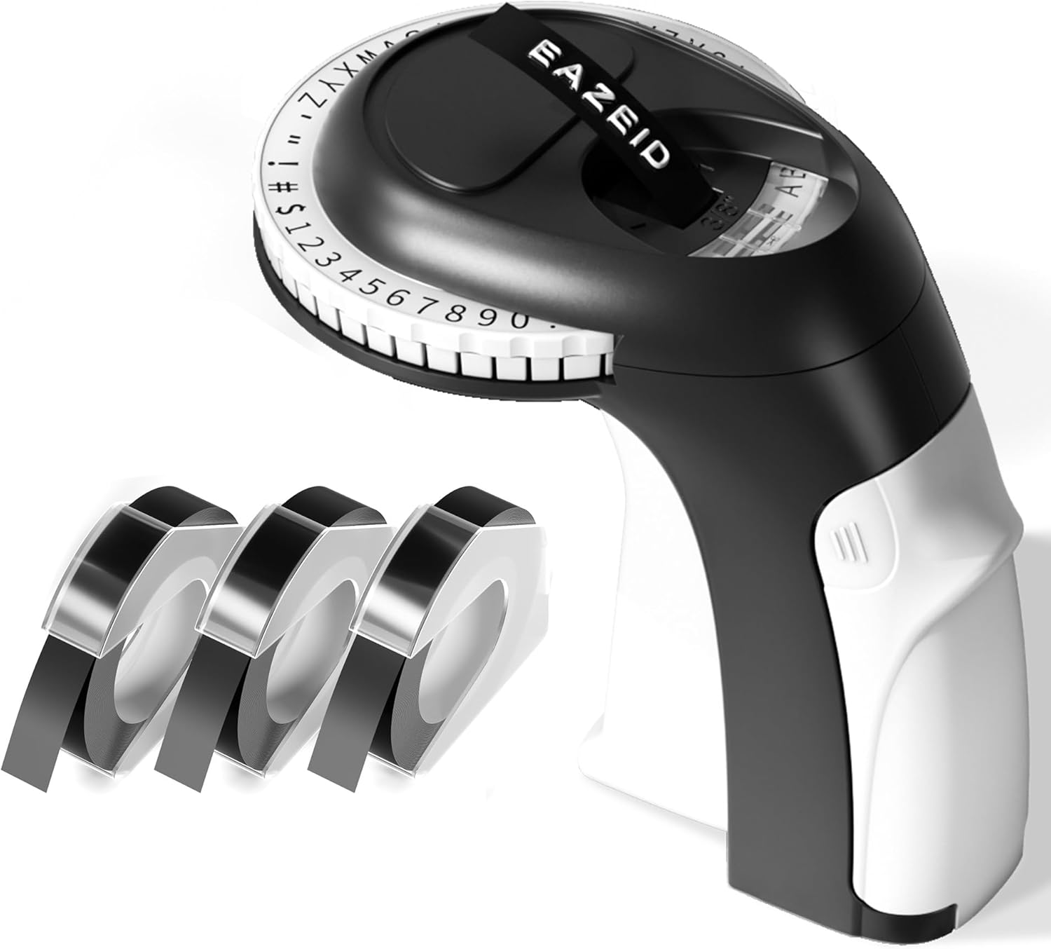 - Manual Old School Design- Black : EazeID black embossing label maker brings back nostalgic 1970s feel with sleek black finish. Embossed Label Maker revives retro charm with 3D raised-letter labels—no ink or batteries needed. Its old-school turn-and-click system creates instant vintage labels for scrapbooks, gifts, or home organization, just like the 1970s classic