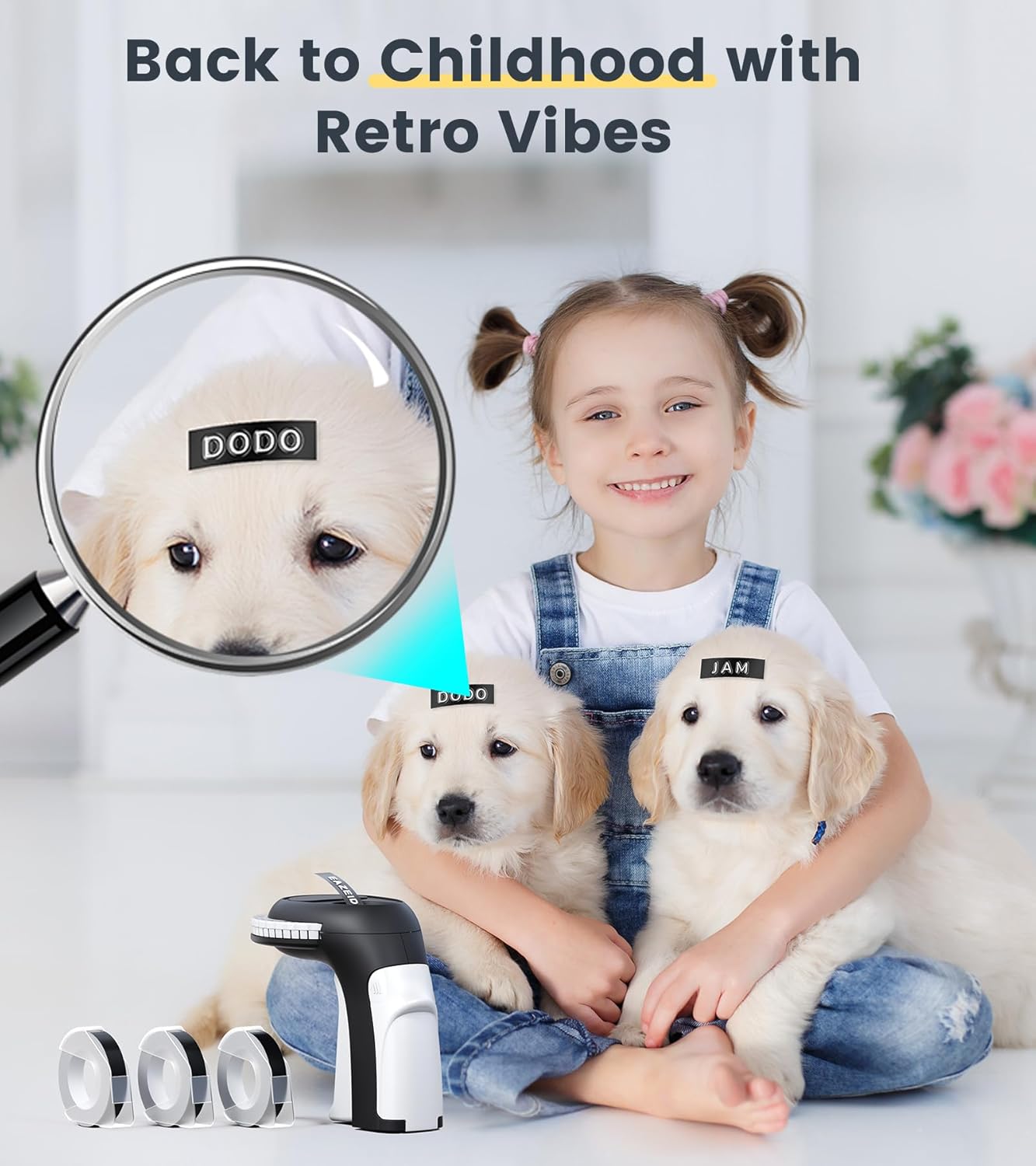 - Portable Ergonomic Labeler with Retro Design : The ergonomic black label maker fits in your palm, featuring a built-in punch cutter and dotted guides. Its retro 1970s style meets modern portability for on-the-go labeling anywhere