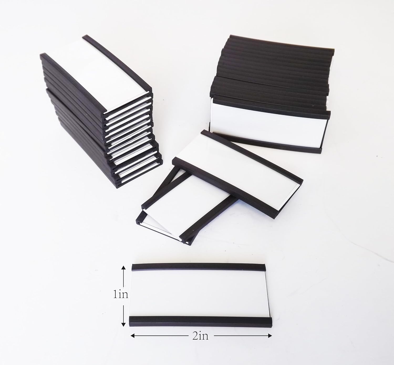 50 Pack C-Channel Magnetic Label Holders (1″ x 2″) with Paper Inserts & Clear Covers – Durable Magnetic Shelf & File Cabinet Labels for Metal Surfaces