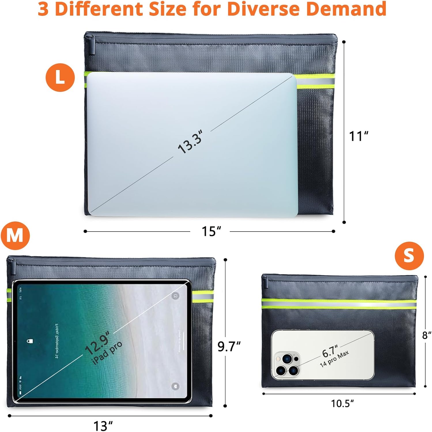 • Three Versatile Sizes: This set includes three fireproof and water- proof pouches—15" x 11", 13" x 9.7", and 10.5" x 8"—designed to store and protect all your valuable items. Ideal for important documents, cash, bank deposits, passports, credit cards, jewelry, keys, certificates, photos, and more.