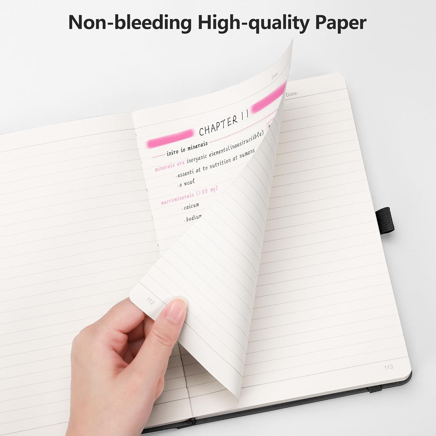 - LINED JOURNAL NOTEBOOK: RETTACY Lined Journal Notebook comes in a A5 size (5.7'' x 8.3''), 192 numbered pages, 7 mm college ruled, durable and smooth leather hardcover, 100 GSM thick acid-free paper, 180° lay-flat, pen holder, elastic closure band, 2 ribbon bookmarks, inner pocket & sticky notes