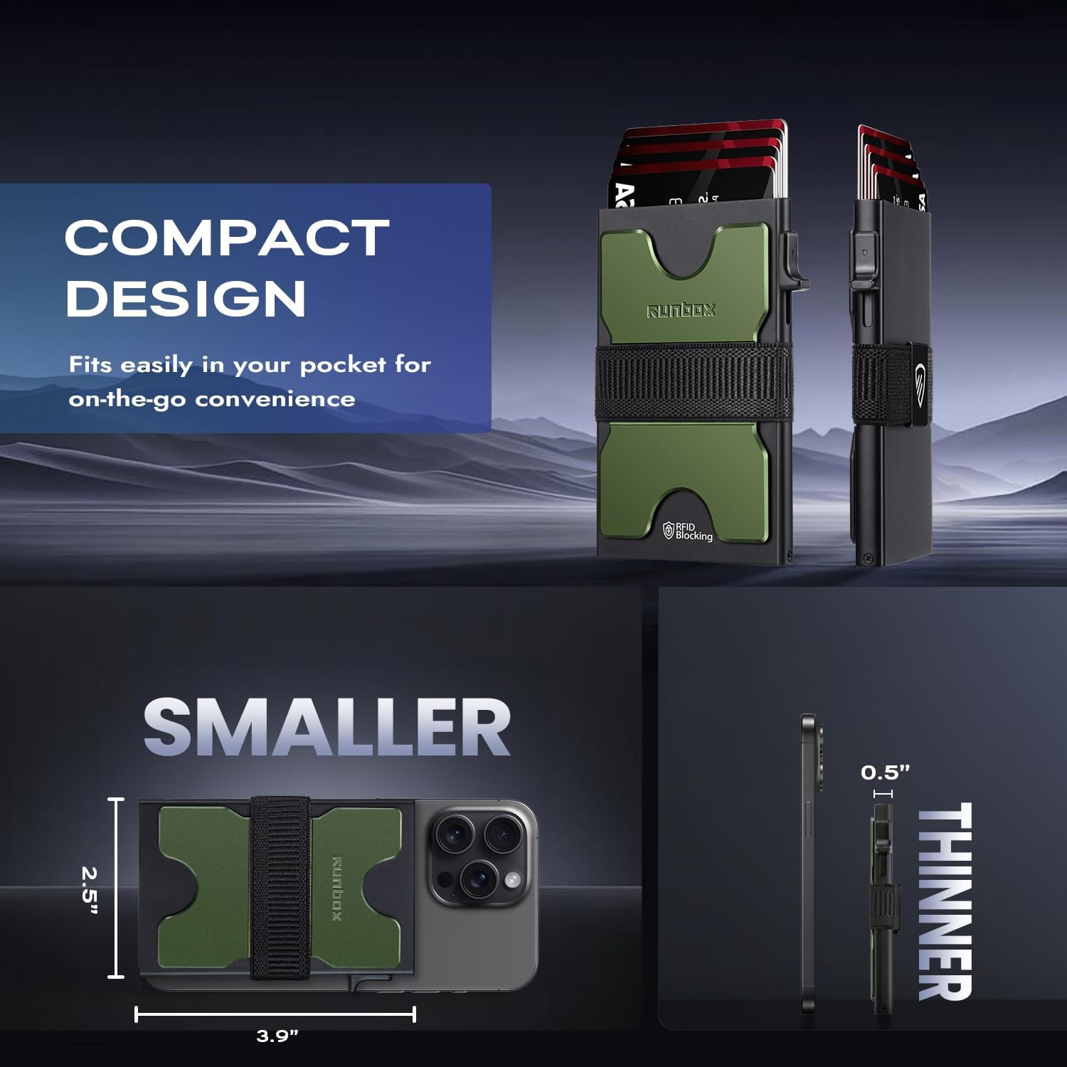 - Quick Access & Expandable Capacity (Holds 1-12 Cards): Experience effortless card access with our patented pop-up button mechanism – press to instantly eject cards. The main aluminum card holder compartment holds 4-6 cards(depending on embossed designs), while the expandable metal backplate adds 6-8 extra slots. *Total capacity varies with card thickness