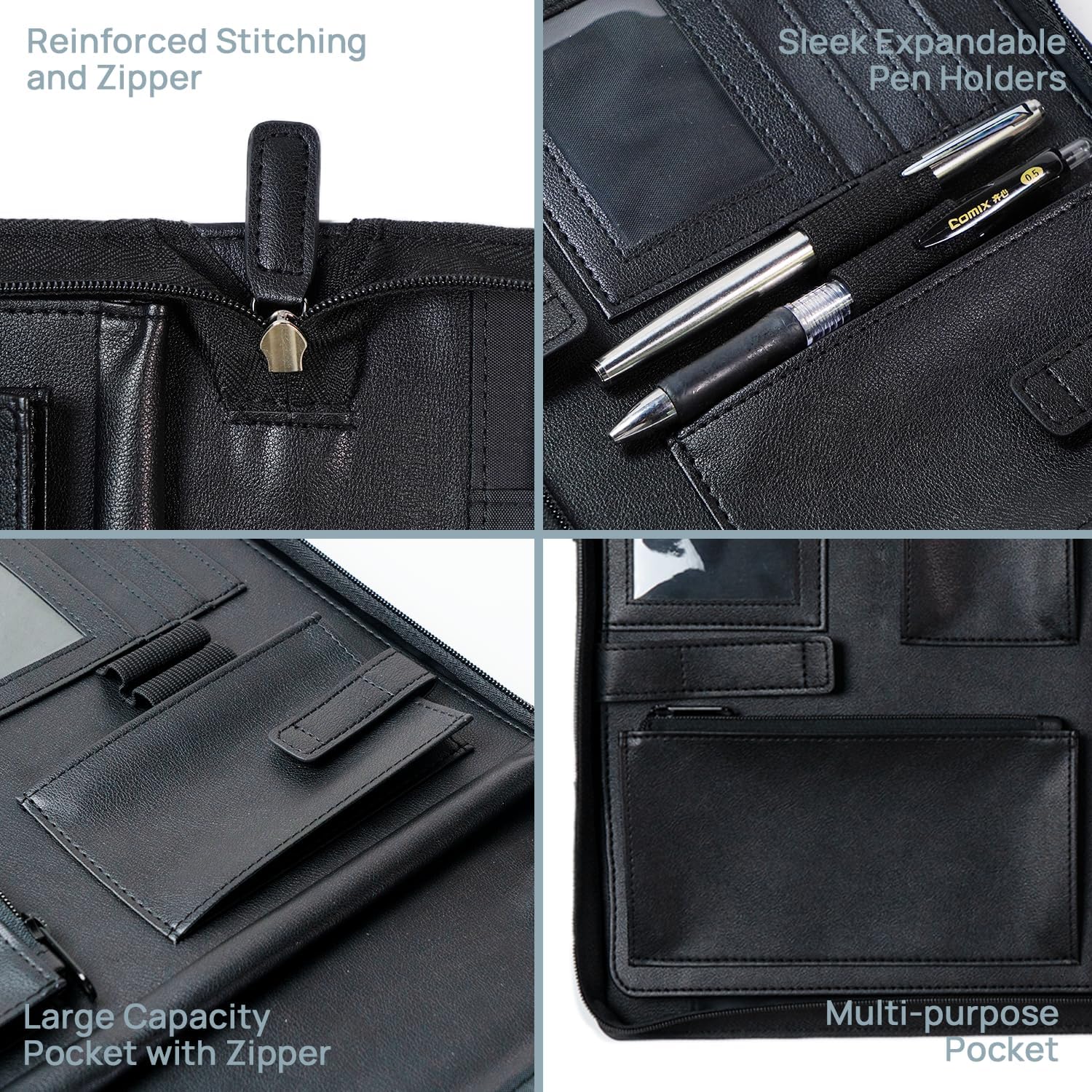 - Premium PU Leather & Professional Design – POPRUN sleek padfolio is crafted from high-quality, water-resistant PU leather with reinforced stitching for durability. The secure zipper closure keeps documents safe, while the lightweight design ensures easy portability. Perfect for work, meetings, or presentations, it combines style and functionality for professionals on the go.