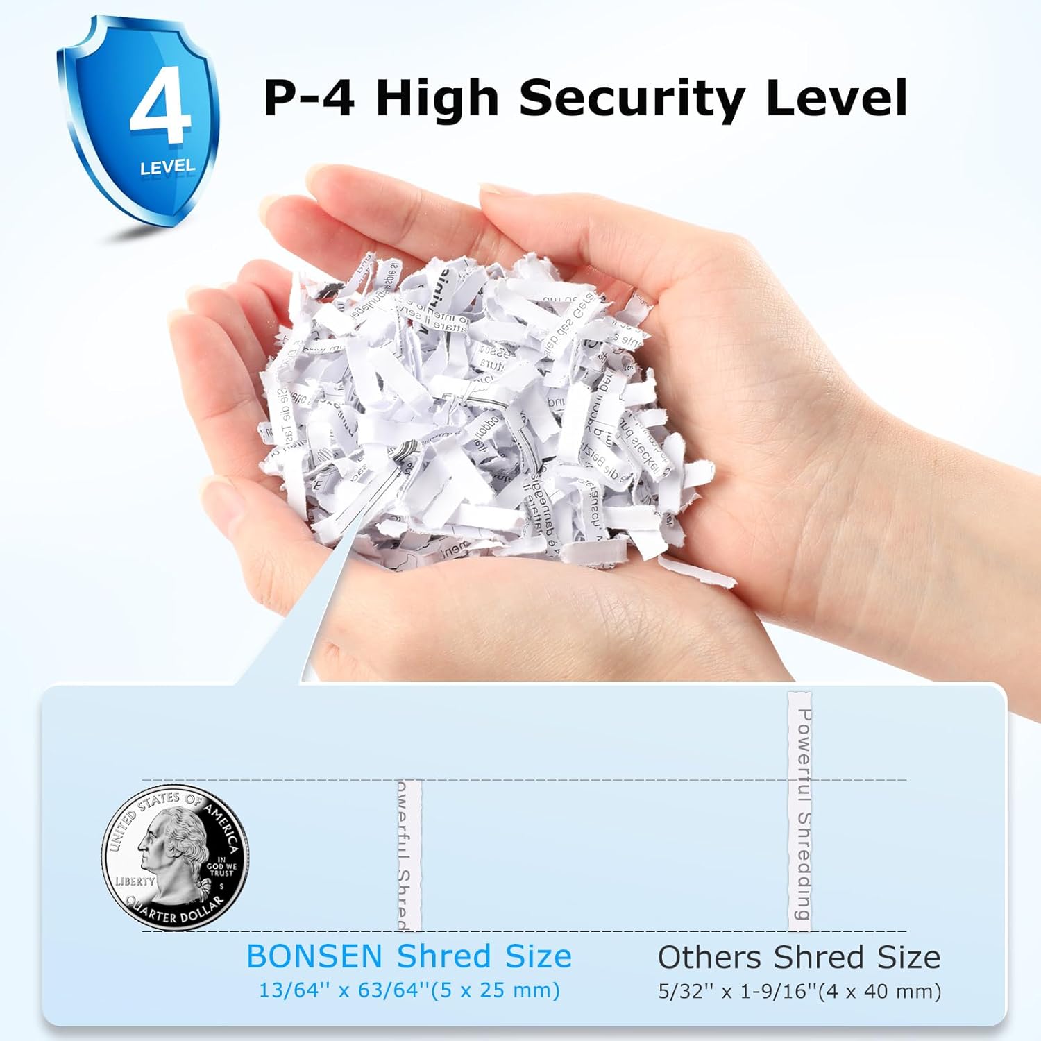- Protect Sensitive Data with Confidence: Achieving a P-4 high-security level, BONSEN home office paper shredder heavy duty can efficiently shreds sensitive documents into tiny particles measuring just 13/64 x 63/64 inches (5 x 25 mm) to keep your information safe.