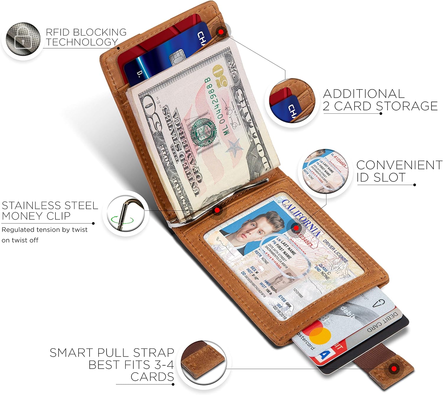 • Minimalist Airtag Wallet - Beautifully crafted from full grain leather, it sports a minimalist design for men who want a slim leather wallet without sacrificing functionality. The ultra-thin wallet is designed to fit directly in the pocket for easy carrying. It best fits 6-8 cards and 10+ bills with an innovative stainless- steel money clip. Wallet Size: 3.9" in. x 2.85" in. 0.5" in.