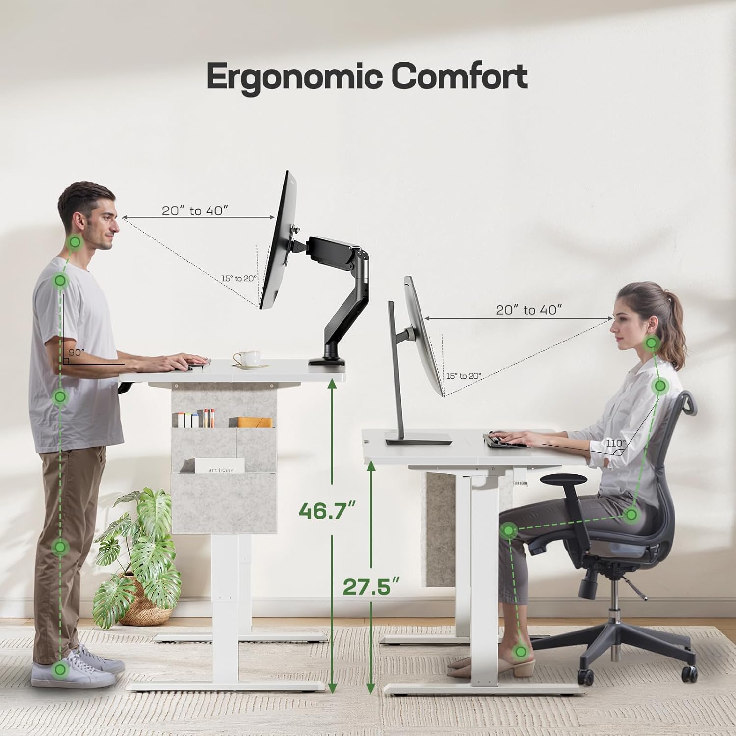 - One-Touch Height Adjustment: The desk offers customizable presets,allowing seamless transitions between sitting and standing with a single touch.With an adjustable height range of 27.5"-46.7",it accommodates users of all heights,promoting better posture and reducing health risks from prolonged sitting.Quick adjustments encourage movement,boost circulation,and reduce fatigue.The intuitive control system simplifies height changes,enhancing comfort and productivity for work,study,or creative tasks.