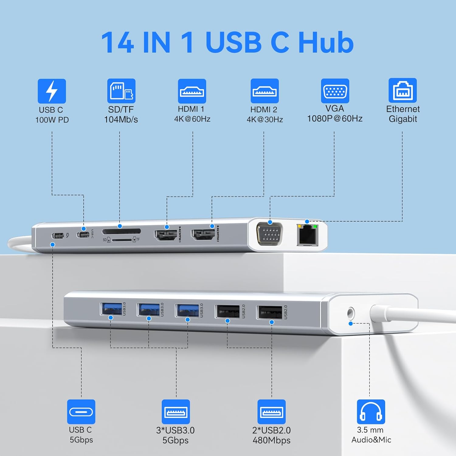 - USB C Docking Station 14 IN 1: With this USB C hub multiple adapter you can easily extend your laptop from one type c/thunderbolt 3 port into 14 ports, you get 2*4K HDMI, VGA, 3*USB 3.0 ports, USB C Data Transfer port(Speed up to 5Gbps), 2*USB 2.0 ports, USB C Power Delivery Port(Up to 100W), Gigabit Ethernet(1Gbps), SD/Micro SD card readers and 3.5mm Mic/audio. USB C to dual HDMI Adapter widely applicable for Dell XPS13/15, Dell Latitude 13 7000/ E7370, Surface/Lenovo/HP etc. laptops