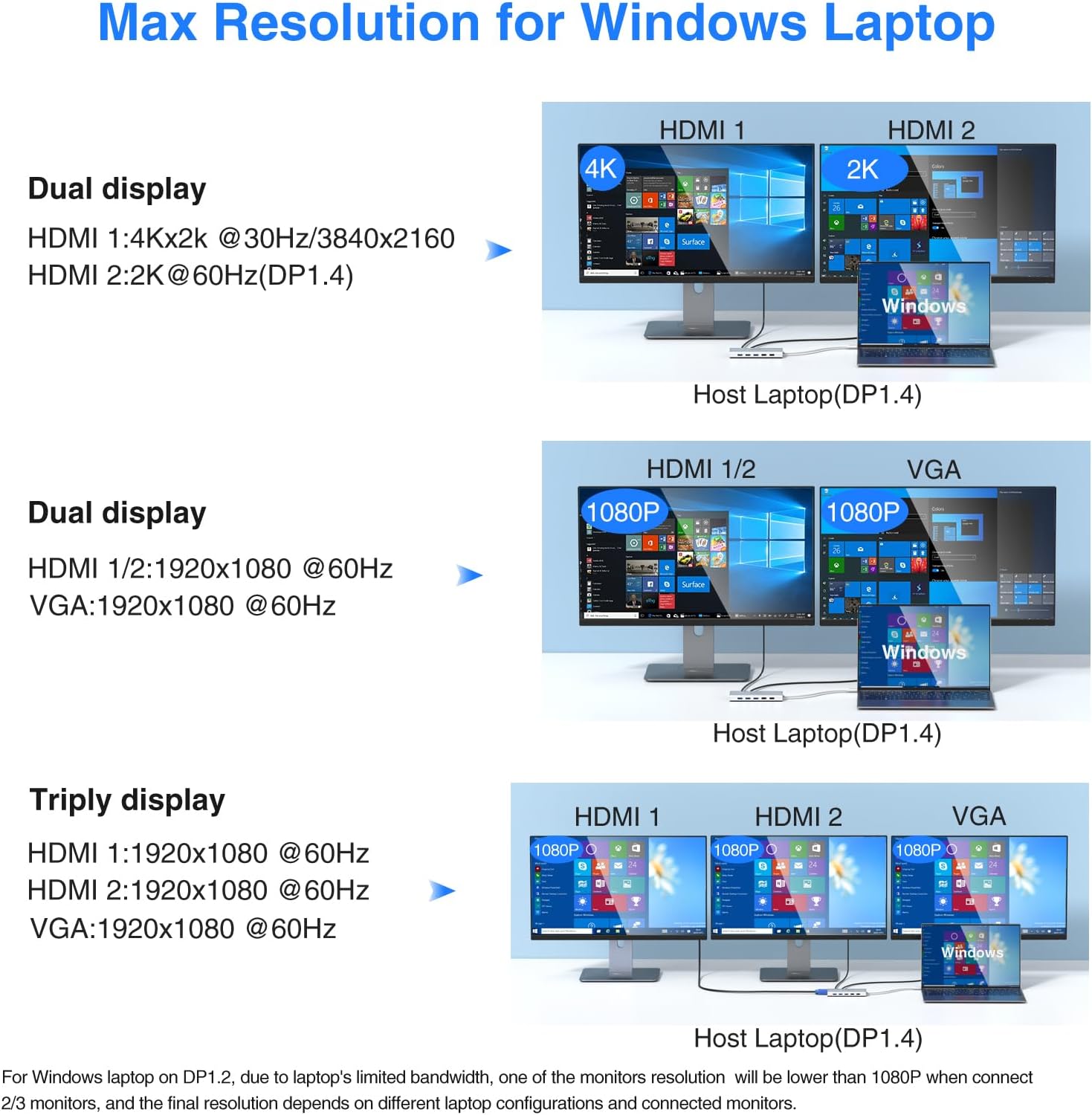 - 4K Dual Monitor&Triple Display: The Docking Station Dual Monitor can easily to achieve dual-monitor and triple-monitor displays for Windows OS, using different monitors to do different projects will make your work/life more efficient. Single use HDMI 1max up to 4K@60Hz, HDMI 2 up to 4K@30Hz(DP1.4 source). When connect 2 displays, 2 HDMI resolution will be 4K@30Hz and 1080P@60Hz(DP1.4). Display output will be 1080P when dual or triple display with VGA. Please Note: Mac OS ONLY support mirror mode