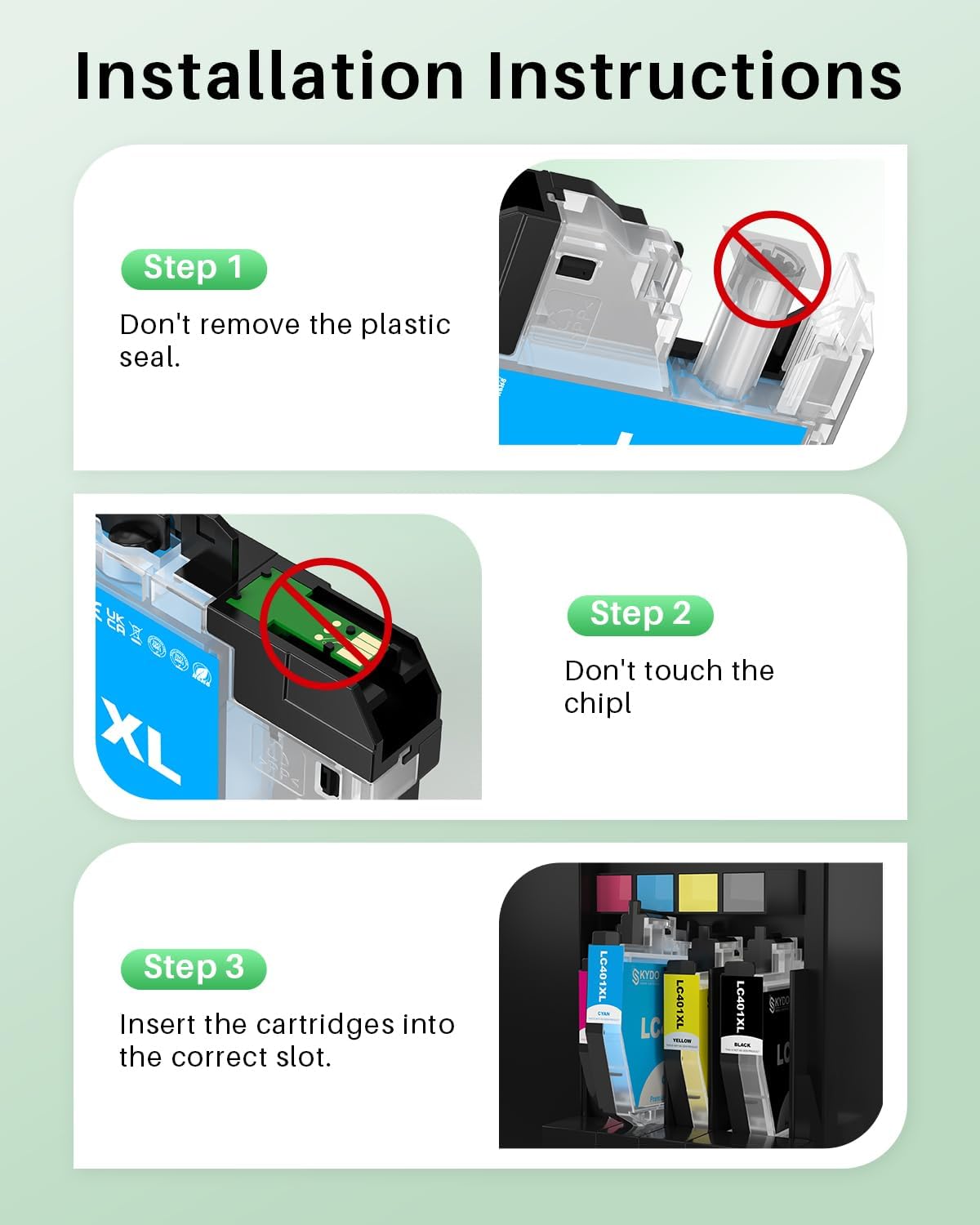 - Item Name: Skydo ink cartridge Compatible lc 401 ink Cartridge Replacement for lc 401xl high yield ink cartridge 4 pack black/cyan/magenta/yellow ink (This is not OEM product)