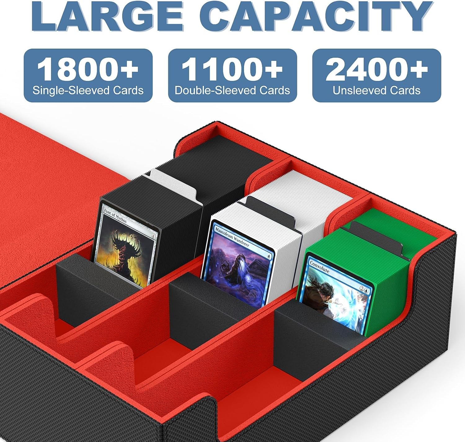 - 【Large Capacity】Measuring 11.5x10x4.2 inches, the card box effortlessly accommodates 1800+ sleeved cards, 1100+ double-sleeved cards and 2400+ unsleeved cards, meeting all your card storage needs.