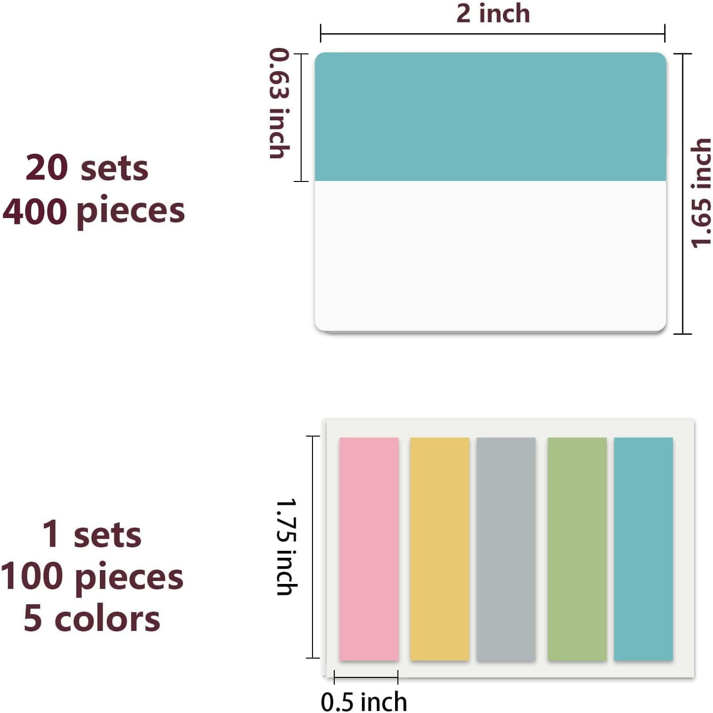 - 500 pieces Book Tabs: 500 pieces 21 sets in total, 400 pieces 2 inch sticky tabs in 20 sets with 10 different pastle colors,100 pieces 0.5 in tabs in 1sets, 20 pieces each color