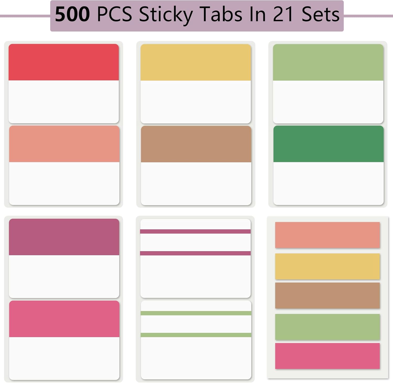 - 500 pieces Book Tabs: 500 pieces 21 sets in total, 400 pieces 2 inch sticky tabs in 20 sets with 10 different pastle colors,100 pieces 0.5 in tabs in 1sets, 20 pieces each color